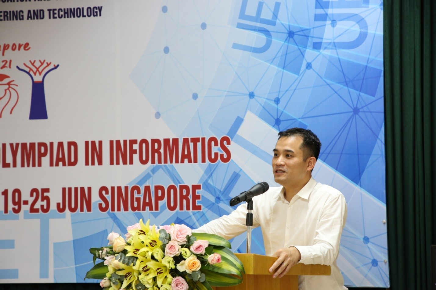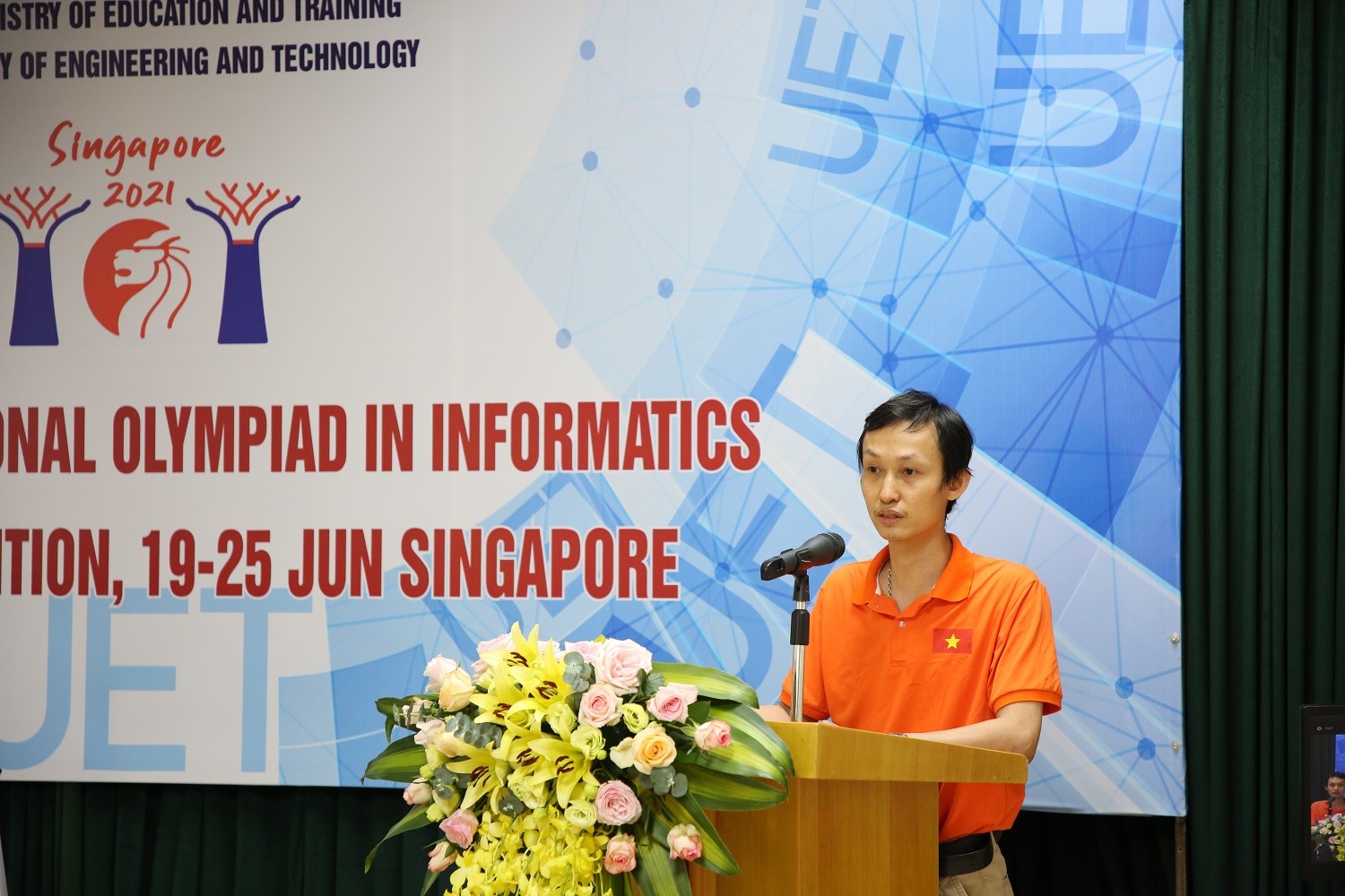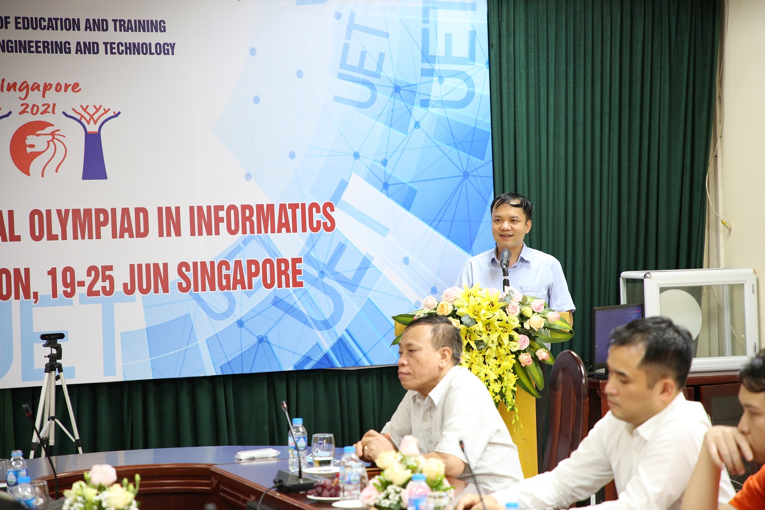 Tại buổi lễ, đại diện cho đoàn dự thi IOI, PGS.TS. Đỗ Phan Thuận – Trưởng đoàn đã báo cáo kết quả kỳ thi. Do diễn biến phức tạp của dịch Covid-19 trên toàn cầu nên đây là năm thứ hai Olympic Tin học quốc tế được đăng cai tại Singapore theo hình thức thi trực tuyến. Trong đó, đoàn Olympic của Việt Nam đã tham dự thi trực tuyến tại Trường ĐHCN từ ngày 19/06 – 25/06/2021. Cuộc thi có 351 thí sinh chính thức đến từ 90 quốc gia và vùng lãnh thổ tham gia. Trong điều kiện dịch Covid-19, Trường Đại học Công nghệ đã thực hiện nghiêm túc công tác phòng chống dịch để tổ chức kỳ thi an toàn theo quy định Ban tổ chức. Các thí sinh làm bài cùng thời điểm trong hai ngày thi 22/06 và 25/06 (mỗi ngày thi làm 3 bài trong 5 giờ trên hệ thống thi trực tuyến CMS từ 18h00 đến 22h00 giờ Việt Nam). Để đảm bảo cho kết quả cuộc thi là trung thực và khách quan các máy thi của thí sinh được ảo hoá và có camera giám sát quay theo thời gian thực. Trước đó, 04 học sinh tham dự IOI 2021 của Việt Nam đã có thời gian tập huấn, chuẩn bị thi thử tại Trường ĐHCN từ ngày 24/05-25/06/2021.