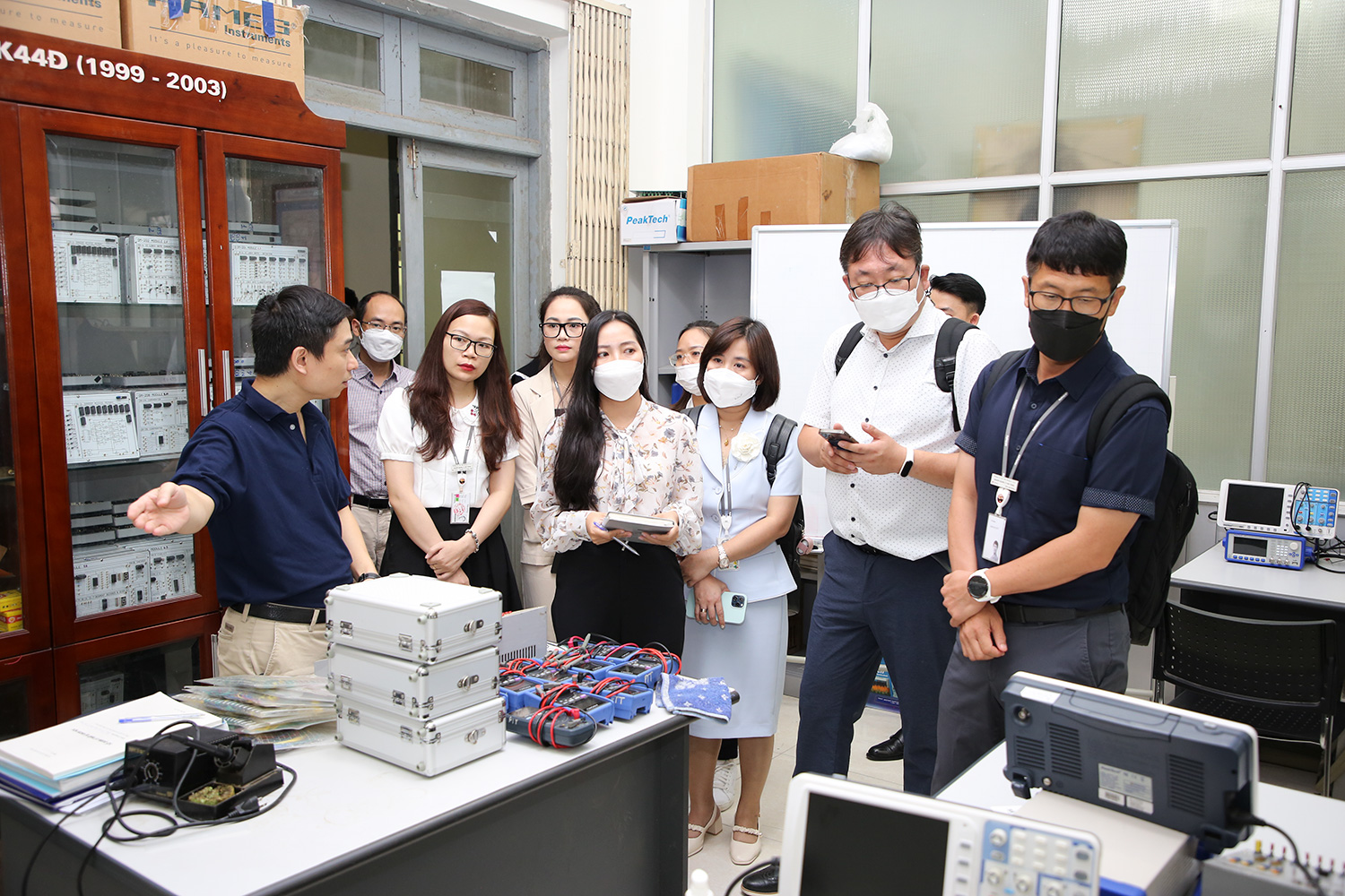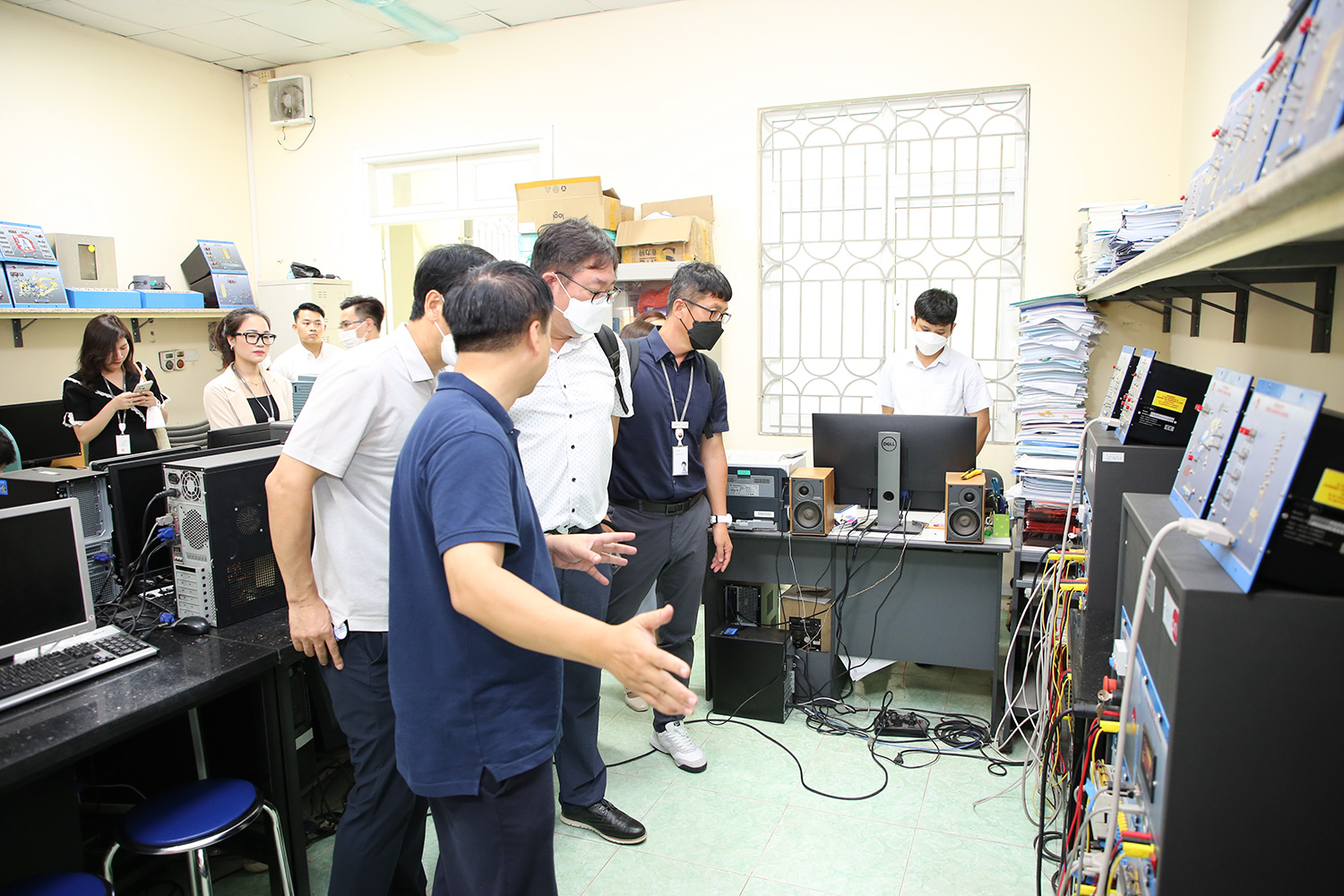 PGS.TS Bùi Thanh Tùng – Phó Chủ nhiệm khoa Điện tử viễn thông (bên trái) giới thiệu thiết bị tại Phòng thực hành/thực tập điện tử viễn thông với đoàn LGDVH