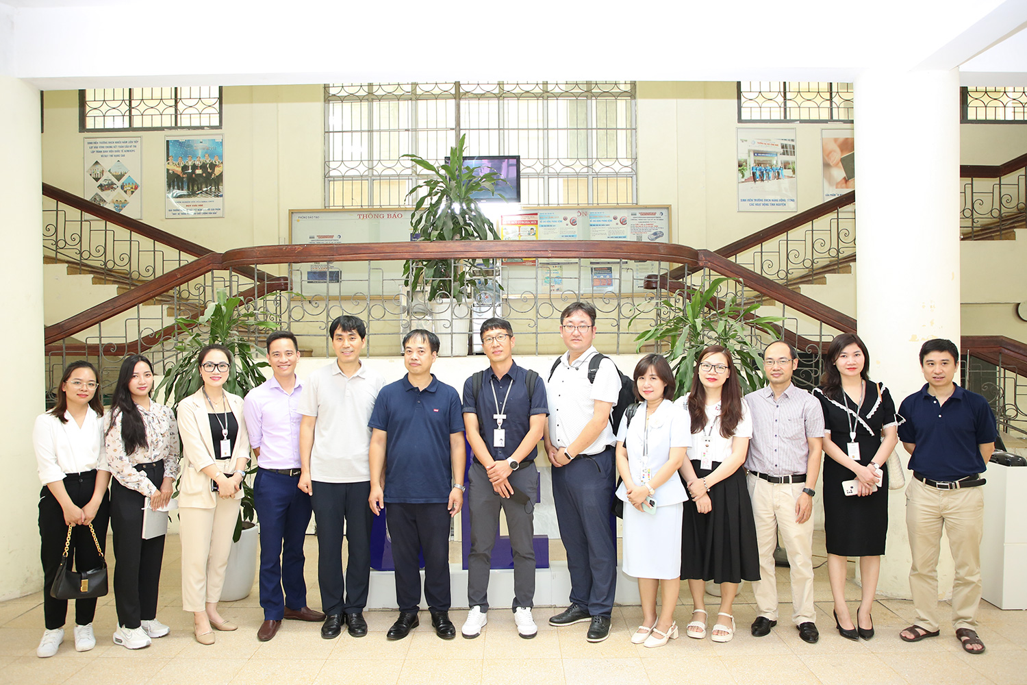 PGS.TS. Nguyễn Hoài Sơn (thứ ba từ phải sang), PGS.TS. Phạm Mạnh Thắng (thứ tám từ phải sang), PGS.TS. Bùi Thanh Tùng ngoài cùng bên phải) chụp ảnh cùng Ông Kim Jae Hong (thứ bảy từ phải sang) – Giám đốc khối Phát triển, Ông Hwang Seung Won (thứ sau từ phải sang) – Giám đốc khối Phát triển và Đoàn Công ty LG Display Việt Nam Hải Phòng