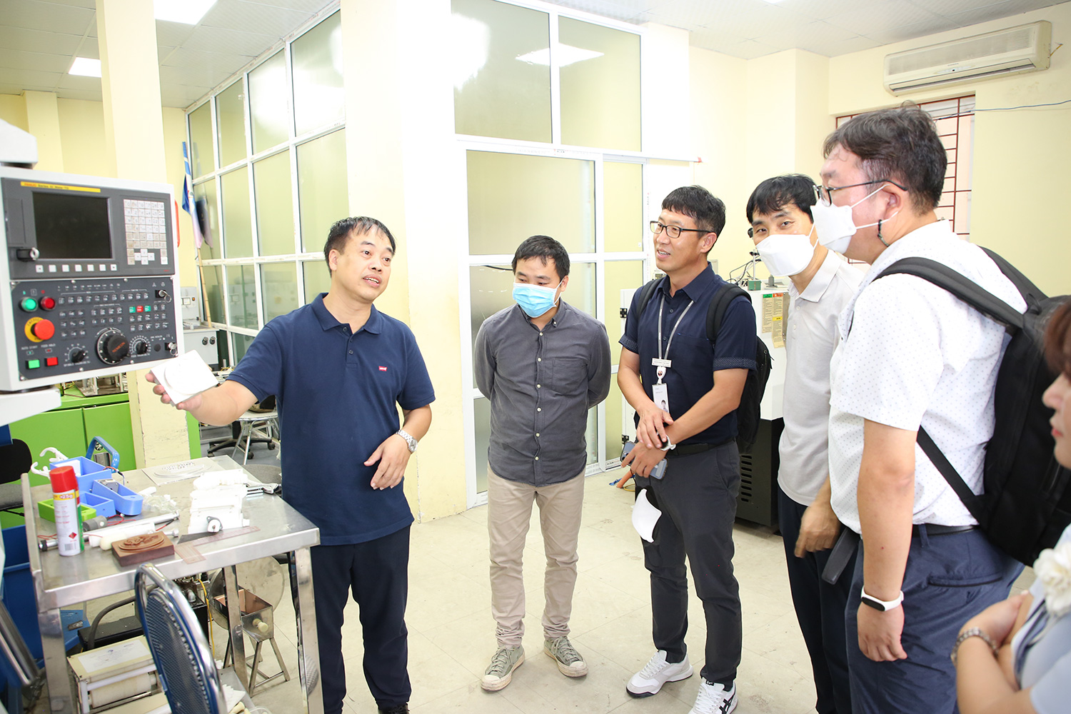 PGS.TS. Phạm Mạnh Thắng – Chủ nhiệm khoa Cơ học kỹ thuật & tự động hóa giới thiệu thiết bị tại Xưởng Cơ khí – tự động hóa, Phòng thí nghiệm Công nghệ Cơ điện tử và thủy tin học với đoàn LGDVH