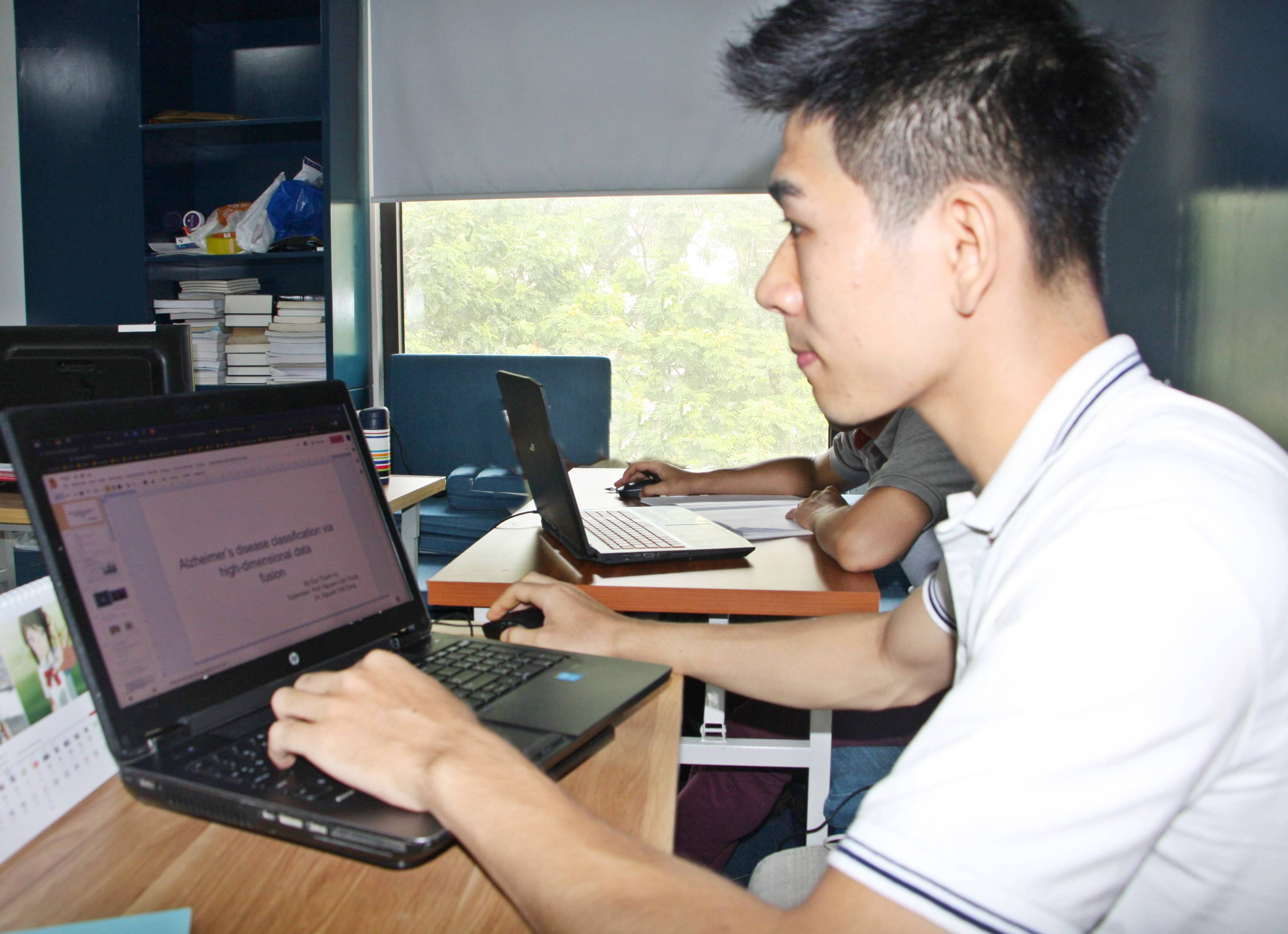 Dựa trên thế mạnh của bản thân và kinh nghiệm tham gia sinh viên nghiên cứu khoa học đạt giải Nhì cấp khoa nên khóa luận tốt nghiệp của Duy Thanh cũng dựa trên những thế mạnh của bản thân. Duy Thanh chia sẻ: “Sau khi nhận được định hướng về đề tài từ PGS.TS. Nguyễn Linh Trung về việc lựa chọn đề tài thiết thực, có ý nghĩa thực tiễn, em dựa vào thế mạnh và lĩnh vực nghiên cứu được phát huy trong thời gian tham gia sinh viên nghiên cứu khoa học cấp khoa. Trong quá trình học tập, em có nền tảng chắc chắn về kiến thức toán cao cấp, đại số, giải tích, xác suất và xử lý tín hiệu thống kê, điều đó giúp em tiếp cận các phương pháp, thuật toán dễ dàng hơn. Ngoài ra, năm thứ 3 em vừa được tham gia thực tập tại phòng thí nghiệm và doanh nghiệp đã giúp em có thêm kinh nghiệm về kỹ năng đọc tài liệu chuyên ngành, nghiên cứu, thực thi, triển khai và áp dụng lý thuyết vào bài toán thực tế qua các đề tài nghiên cứu khoa học. Vì vậy, trong 4 tháng tập trung tìm tài liệu tham khảo cho đến khi xác định được phương pháp và hướng nghiên cứu, em đã hoàn thành khóa luận tốt nghiệp với đề tài “Sử dụng ảnh PET/MRI cho chuẩn đoán bệnh Alzheimer””. Dự định trong thời gian tới của Duy Thanh là tiếp tục nghiên cứu tại trường ĐHCN để học hỏi kiến thức, kinh nghiệm nhằm hoàn thiện bản thân hơn nữa.