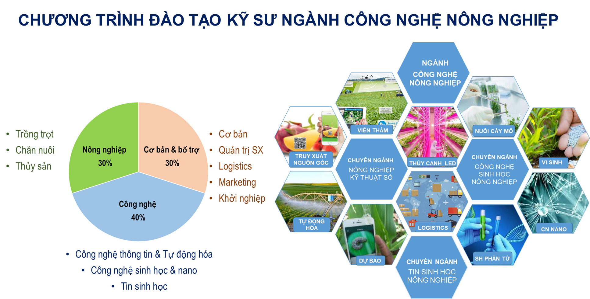 Dựa trên thế mạnh về nền tảng công nghệ của trường, chương trình đào tạo kỹ sư ngành Công nghệ Nông nghiệp trang bị cho sinh viên các kiến thức và kỹ năng liên ngành về công nghệ (như công nghệ thông tin, công nghệ tự động hóa, công nghệ sinh học, công nghệ nano…) và nông nghiệp để sinh viên có khả năng phát triển công nghệ và hoàn thiện quy trình công nghệ sản xuất nông nghiệp, góp phần tăng hiệu quả và tính bền vững, tạo ra các sản phẩm nông nghiệp có giá trị cao, an toàn. Ngoài ra, trong chương trình còn có khối kiến thức về quản trị sản xuất, logistics, marketing và khởi nghiệp đáp ứng nhu cầu xã hội của các kỹ sư công nghệ nông nghiệp thời đại mới. Chương trình đào tạo có 3 định hướng chuyên ngành: Nông nghiệp kỹ thuật số, Công nghệ sinh học nông nghiệp và Tin sinh học nông nghiệp.