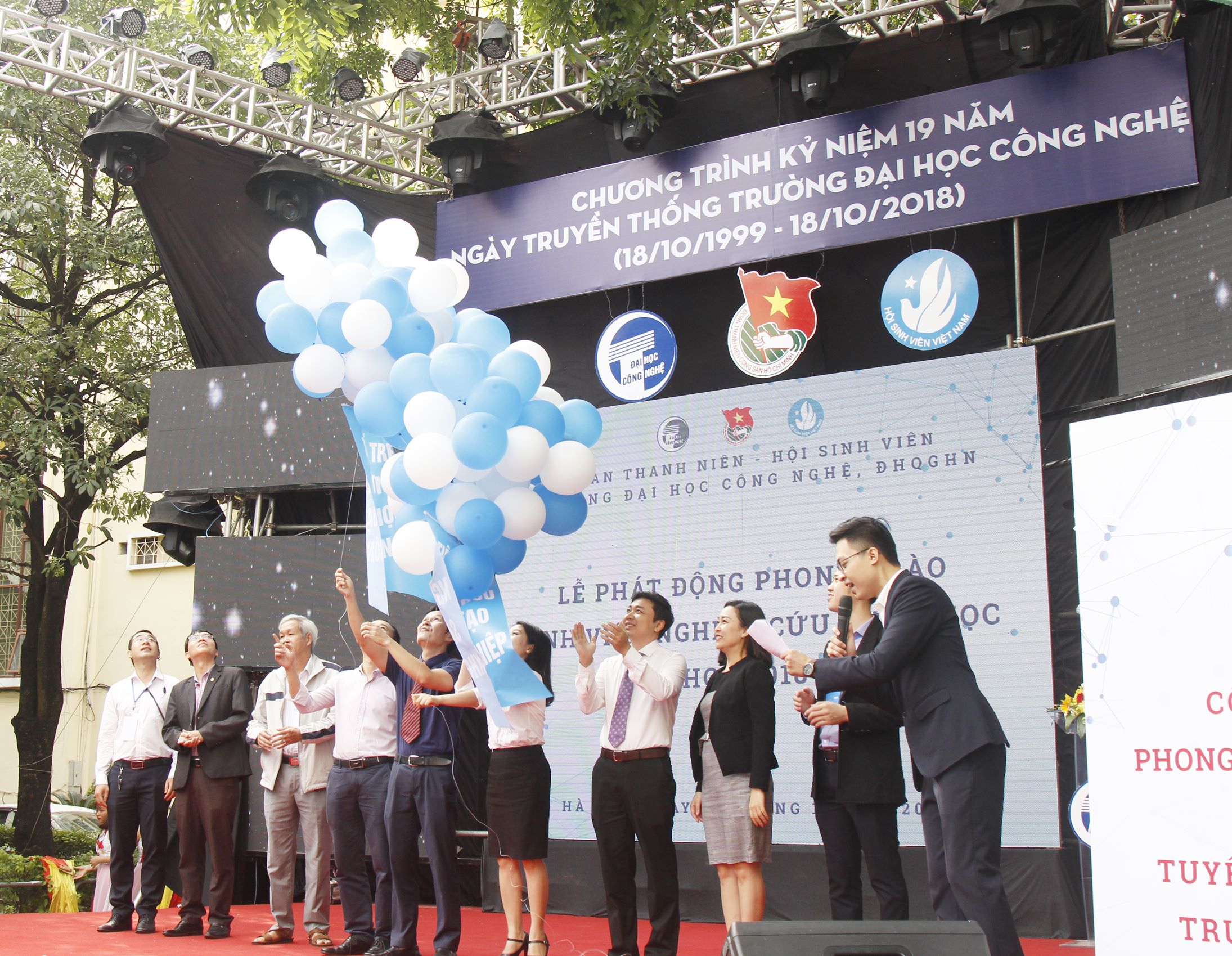 Trong khuôn khổ Ngày hội, Đoàn Thanh niên – Hội Sinh viên đã phối hợp cùng Phòng KHCN&HTPT tổ chức tổng kết phong trào Sinh viên nghiên cứu khoa học năm học 2017 – 2018 và phát động phong trào sinh viên nghiên cứu khoa học năm học 2018 – 2019. Phó Hiệu trưởng Nguyễn Anh Thái cùng đ/c Chu Hồng Minh – Phó Chủ tịch Trung ương Hội Sinh viên Việt Nam, Phó Bí thư Thành Đoàn, Chủ tịch Hội Sinh viên Việt Nam Thành phố Hà Nội đã thả 2 chùm bóng bay với khẩu hiệu “Tuổi trẻ Trường Đại học Công nghệ tiên phong nghiên cứu, sáng tạo khởi nghiệp” lên bầu trời để khẳng định vai trò đi đầu của phong trào sinh viên nghiên cứu khoa học trong thời kỳ cách mạng công nghiệp 4.0 dưới sự chứng kiến của các thầy cô và sinh viên toàn trường.