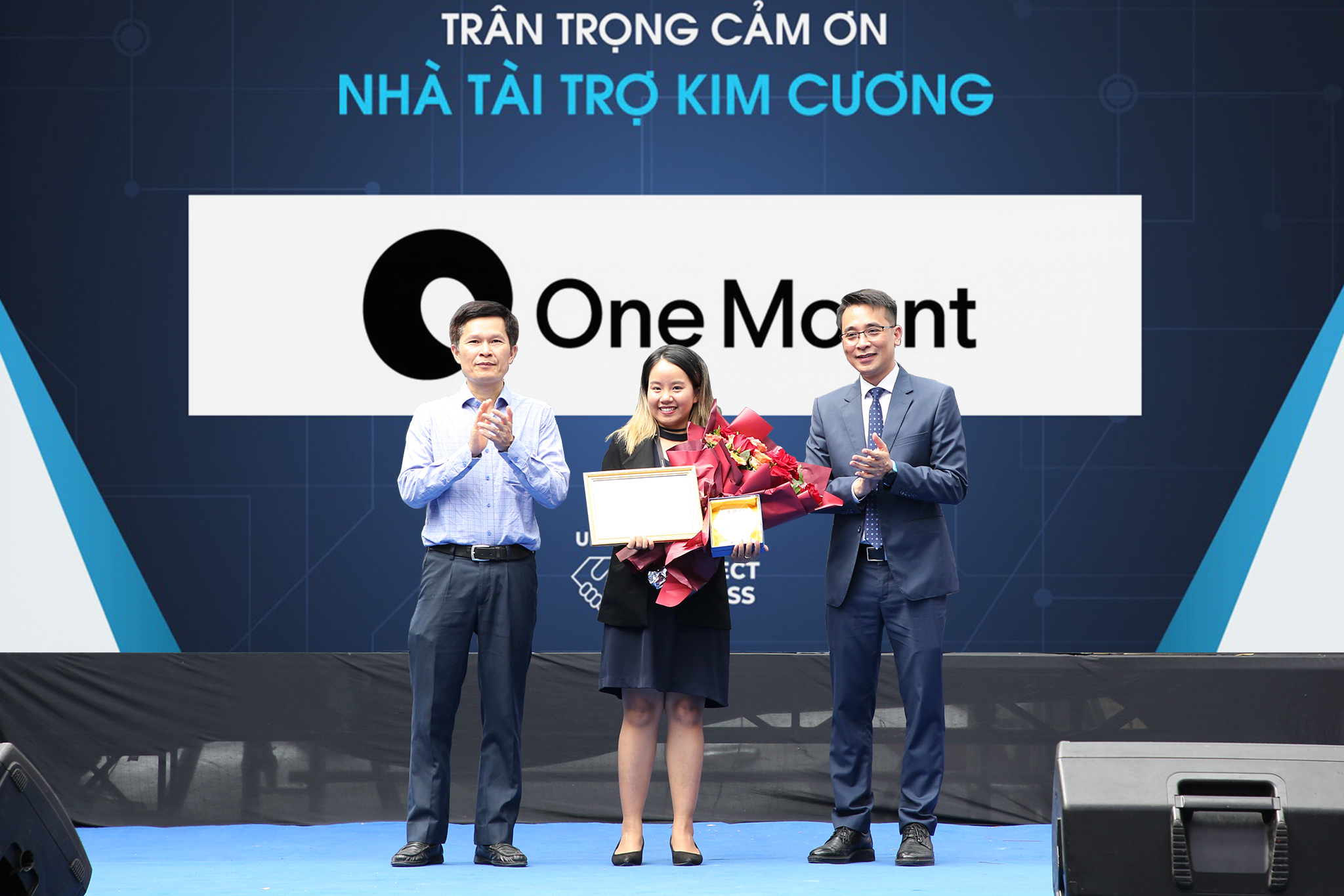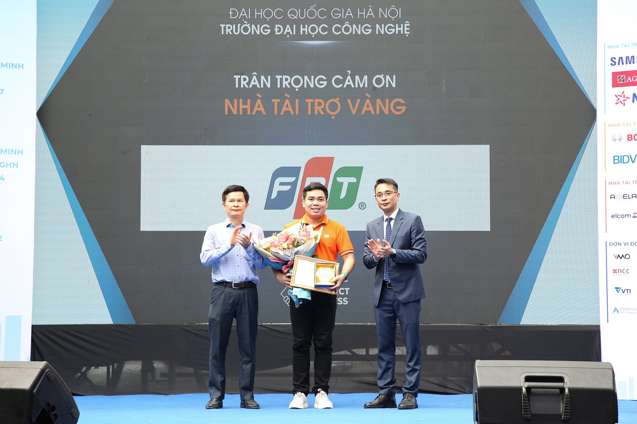 TS. Nguyễn Anh Thái – Phó Hiệu trưởng Nhà trường (bên trái) và GS.TS. Chử Đức Trình – Phó Hiệu trưởng Nhà trường (bên phải) tặng hoa cảm ơn nhà tài trợ Kim cương và Vàng