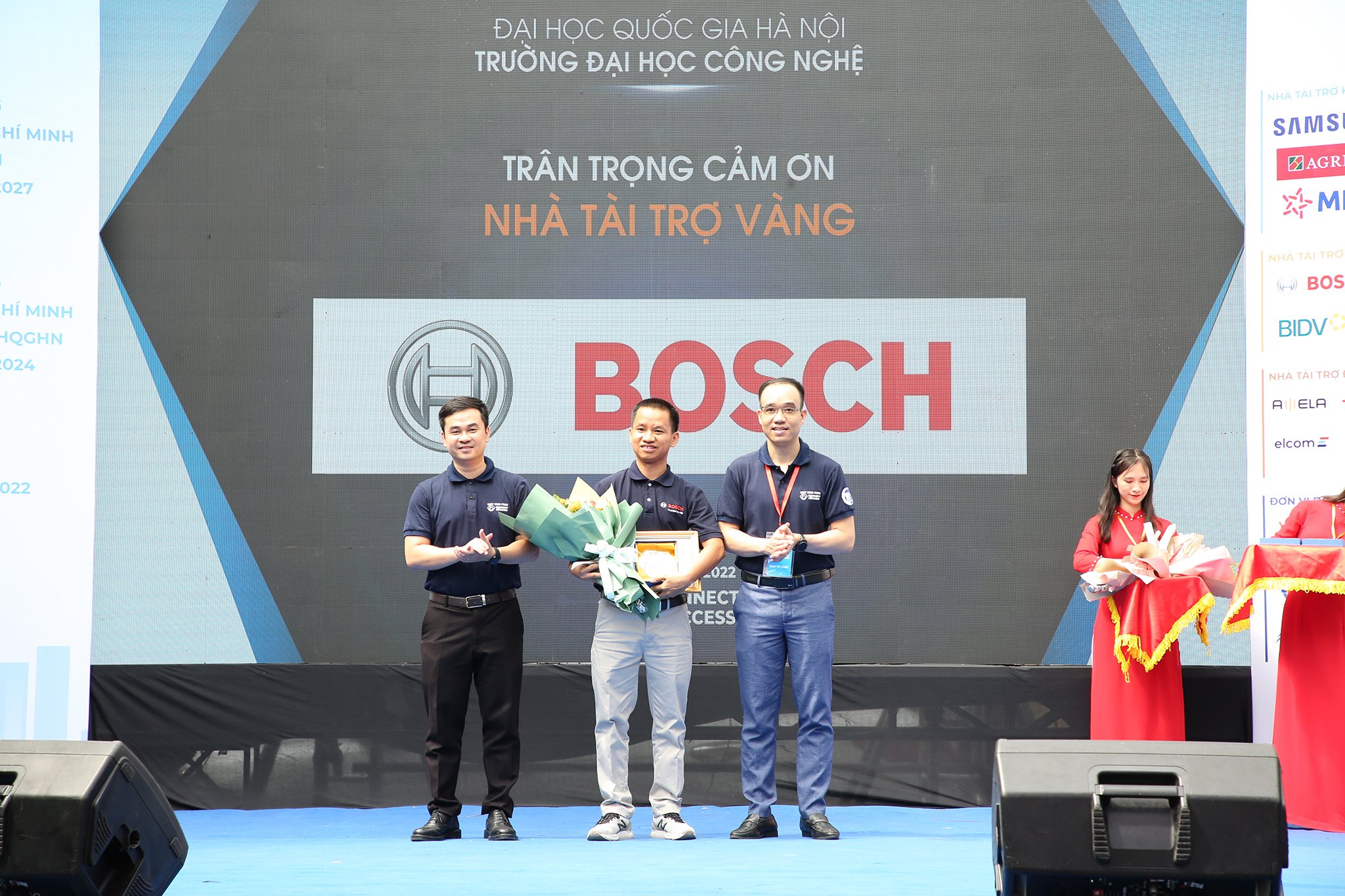 TS. Trần Cường Hưng – Bí thư Đoàn thanh niên (bên trái) và ThS. Phan Hoàng Anh – Chủ tịch Hội sinh viên (bên phải) tặng hoa cảm ơn nhà tài trợ Bạc và Đồng