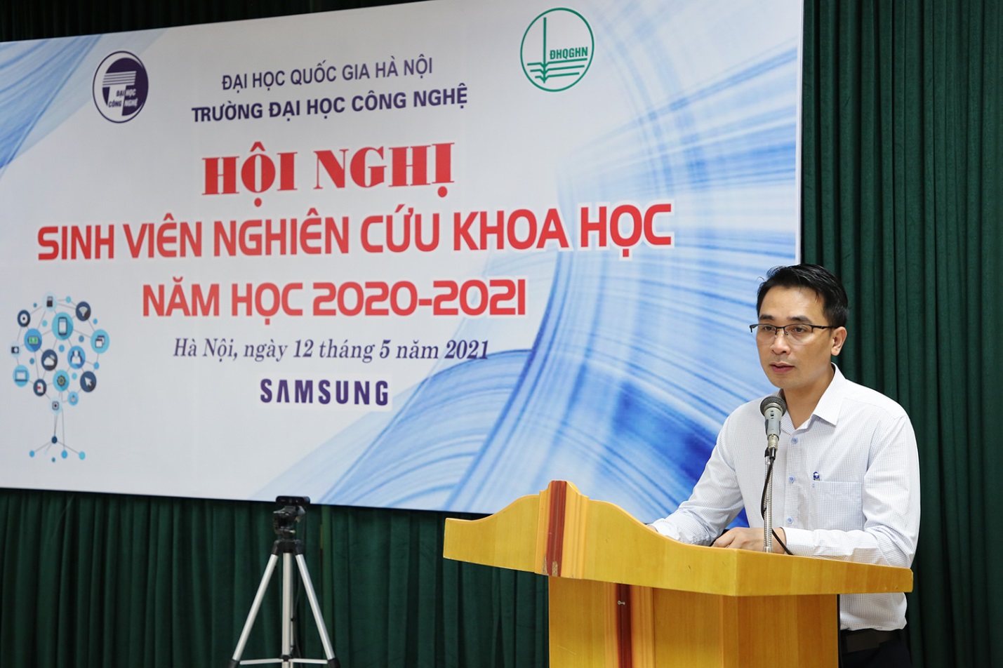 Phát biểu khai mạc Hội nghị, GS.TS Chử Đức Trình nêu bật ý nghĩa của công tác nghiên cứu khoa học với sự phát triển của Trường ĐHCN cũng như một số thành tích nổi bật về KHCN trong giai đoạn vừa qua và các đánh giá chung về nghiên cứu khoa học của sinh viên. GS. TS. Chử Đức Trình khẳng định hoạt động sinh viên nghiên cứu khoa học luôn được Trường ĐHCN chú trọng đầy mạnh, giúp ích rất nhiều trong việc bổ sung tri thức cho sinh viên, tạo cho sinh viên có khả năng nghiên cứu độc lập. Vì vậy, Nhà trường luôn động viên và tạo điều kiện để sinh viên tham gia nhóm nghiên cứu của các thầy cô, khoa viện, trung tâm nghiên cứu từ năm thứ nhất. Năm 2021 do ảnh hưởng của dịch Covid, ngày hội sinh viên nghiên cứu khoa học cấp trường được tổ chức với hình thức trực tuyến nhưng kết quả nghiên cứu vẫn được thể hiện trước hội đồng. Ngày hội nghiên cứu khoa học sinh viên năm nay thu hút 54 công trình nghiên cứu với 174 sinh viên tham gia, dưới sự hướng dẫn 59 giảng viên ở nhóm nghiên cứu cấp khoa. Trải qua các vòng thi cấp khoa, 38 công trình được lựa chọn và đến với ngày hội nghiên cứu khoa học sinh viên cấp trường. Bên cạnh đó, năm 2020, cán bộ và giảng viên Nhà trường thu hút nhiều đề tài các cấp với tổng kinh phí hơn 40 tỷ đồng, đồng thời phát triển một số sản phẩm công nghệ sẵn sàng chuyển đến doanh nghiệp, xã hội. Cán bộ khoa học của Nhà trường xuất bản hơn 200 bài báo, trong đó đặc biệt là nhóm nghiên cứu của GS.TS. Hoàng Nam Nhật (khoa Vật lý kỹ thuật và công nghệ nano) đã xuất bản bài báo xuất sắc trên Tạp chí Nature. Qua đó, Nhà trường đã xây dựng môi trường học tập, nghiên cứu khoa học sáng tạo, tích cực, chất lượng cao đáp ứng kỳ vọng của các thầy cô, sinh viên đã, đang sẽ tham gia mái nhà chung trường ĐHCN.