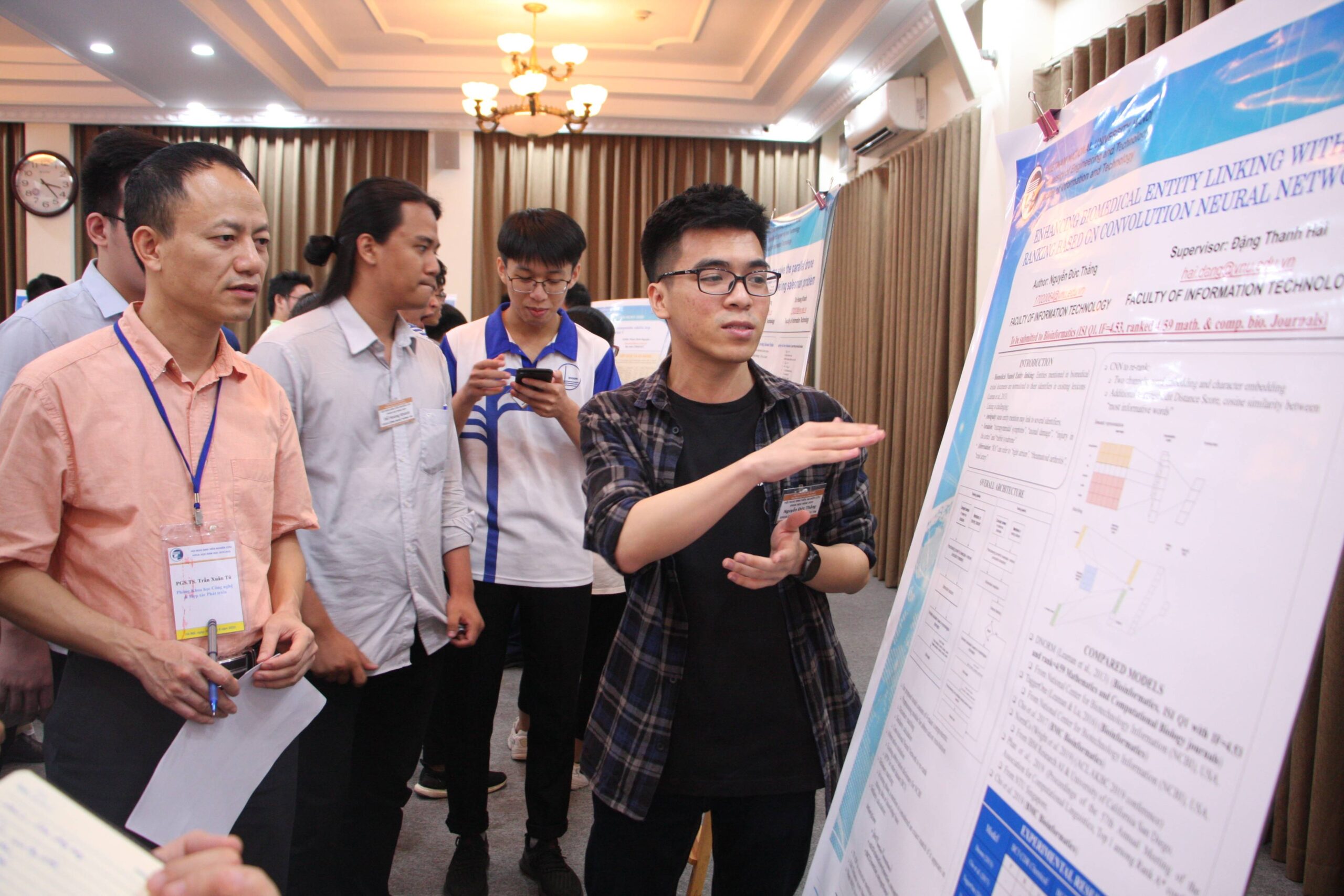 Khi còn là một cậu học sinh THPT, Nguyễn Đức Thắng đã đạt giải nhất môn Tin học cấp quốc gia, từ đó Đức Thắng đã có niềm đam mê tìm hiểu, khám phá và nghiên cứu các thuật toán. “Cho đến khi vào học tại Trường Đại học Công nghệ (ĐHQGHN), thuật toán không chỉ là niềm đam mê của bản thân mà em còn mong muốn áp dụng những thuật toán đó vào cuộc sống. Ngay từ lúc đó, em đã quyết định tham gia vào phòng thí nghiệm mục tiêu Tin sinh y học do TS. Đặng Thanh Hải phụ trách. Bởi vì, em nhận thấy việc kết hợp Tin học vào lĩnh vực Y Sinh là xu hướng mới và thú vị nên em muốn tìm hiểu thêm về lĩnh vực này” – sinh viên Nguyễn Đức Thắng chia sẻ. Và Nguyễn Đức Thắng dưới sự hướng dẫn của TS. Đặng Thanh Hải đã triển khai nghiên cứu đề tài “Enhancing biomedical entity linking with re-ranking based on convolution neural networks” (“Nâng cao chất lượng liên kếtt hực thể sinh học bằng cách xếp hạng lại dựa trên mạng nơ-ron tích chập”).