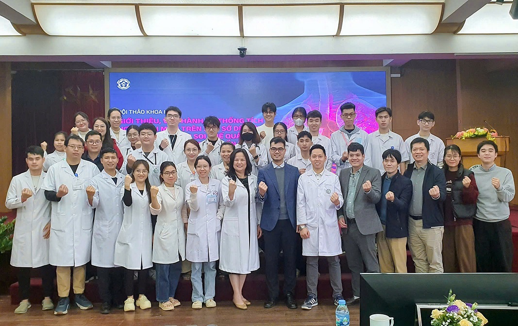 TS. Trần Quốc Long (thứ 3, từ phải sang) – Viện trưởng Viện AI, TS. Lê Đức Trọng (thứ 5, từ phải sang) và TS. Tạ Việt Cường (thứ 4, từ phải sang) cùng nhóm nghiên cứu tại Hội thảo khoa học: “Giới thiệu, vận hành hệ thống tích hợp phần mềm trên 3 cơ sở dữ liệu: CT lồng ngực, Nội soi phế quản và Mô bệnh học trong chẩn đoán ung thư phổi” diễn ra ngày 06/3/2025 tại Bệnh viện Bạch Mai