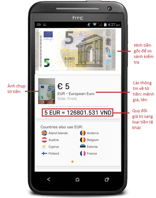 Sau khi nhận dạng được tiền, ứng dụng sẽ hiện ra hình ảnh gốc của tờ tiền để người dùng so sánh xem kết quả nhận dạng có chính xác không. Bên cạnh đó, giá trị tờ tiền được nhận dạng sẽ được quy đổi sang các loại tiền tệ theo lựa chọn của người dùng. Lịch sử nhận dạng sẽ được lưu lại cho mục đích tra cứu, thống kê của khách hàng. Ngoài ra, người sử dụng cũng có thể chọn nhập số để chuyển đổi tỷ giá tiền như các ứng dụng hiện có. Tỷ giá quy đổi được tự động cập nhật hàng ngày.