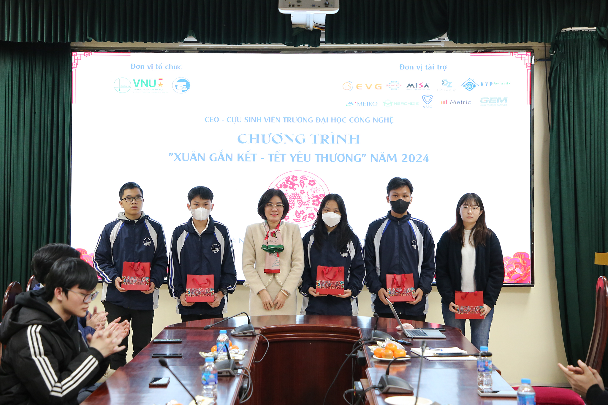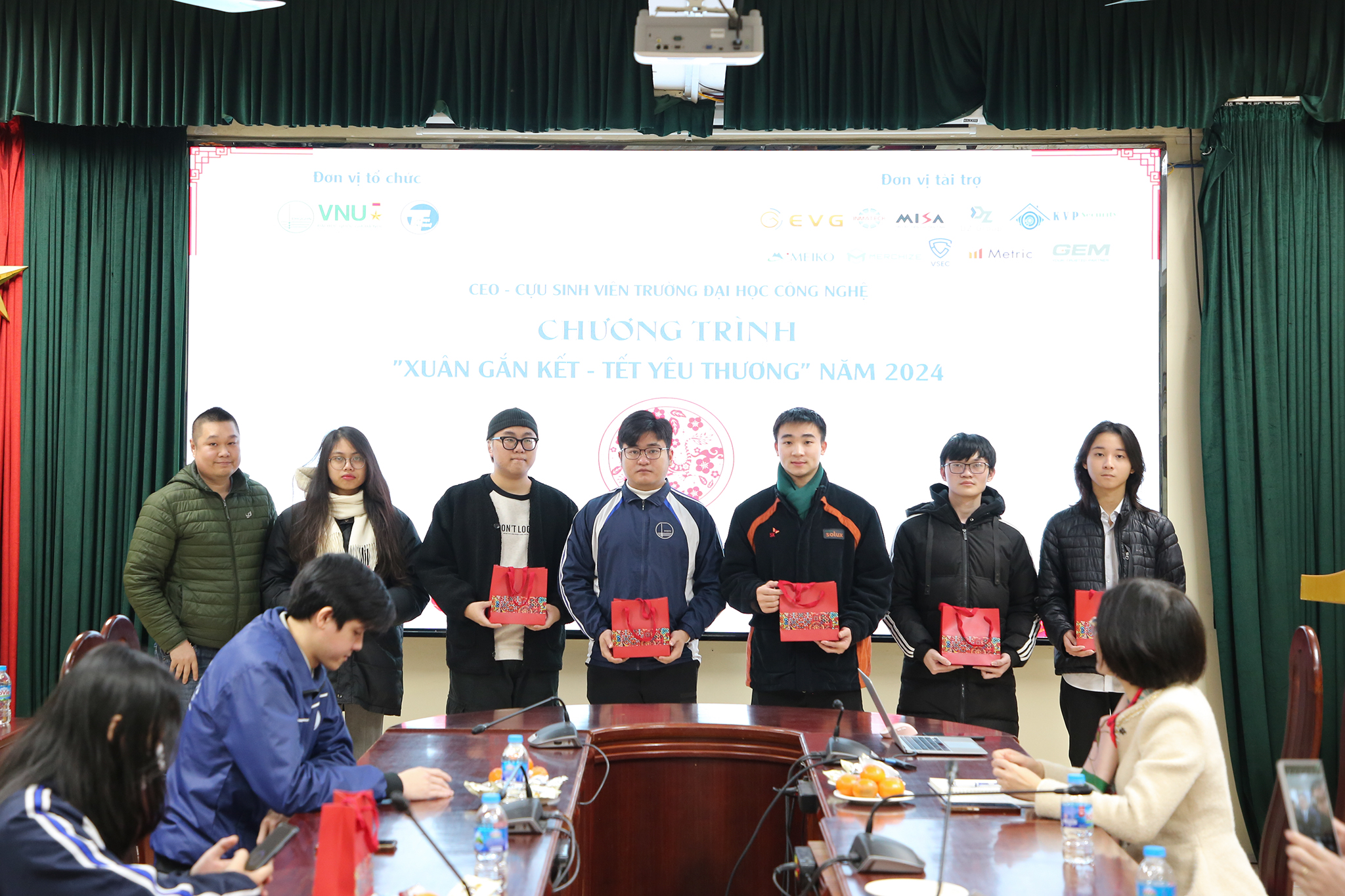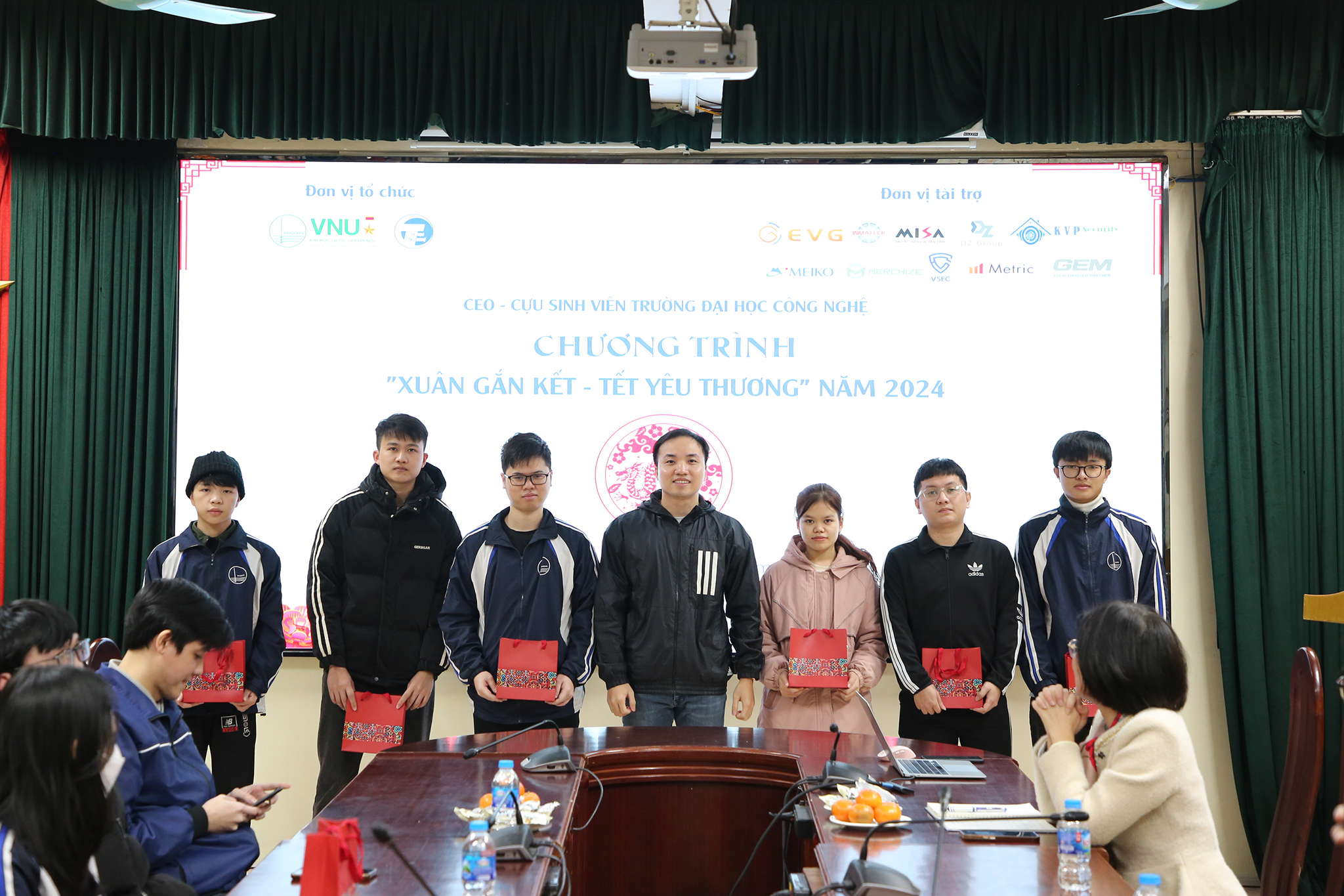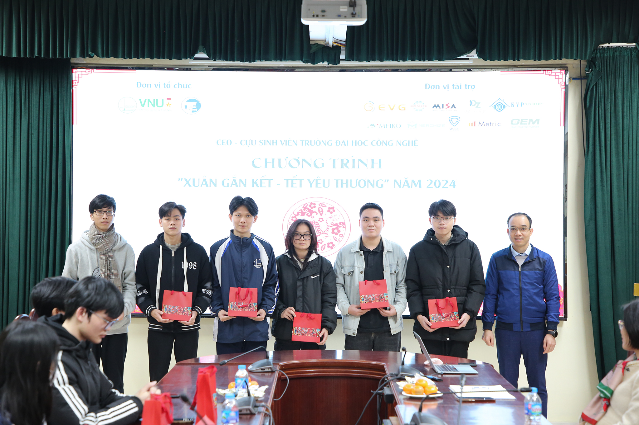 Với tinh thần “Xuân gắn kết – Tết yêu thương”, chiều ngày 29/01/2024, Trường Đại học Công nghệ – Đại học Quốc gia Hà Nội (VNU-UET) phối hợp với Ban Liên lạc cựu sinh viên, đại diện các CEO của doanh nghiệp đã tổ chức gặp mặt, tặng quà cho các sinh viên quốc tế, sinh viên có hoàn cảnh khó khăn nhân dịp Xuân Giáp Thìn 2024.