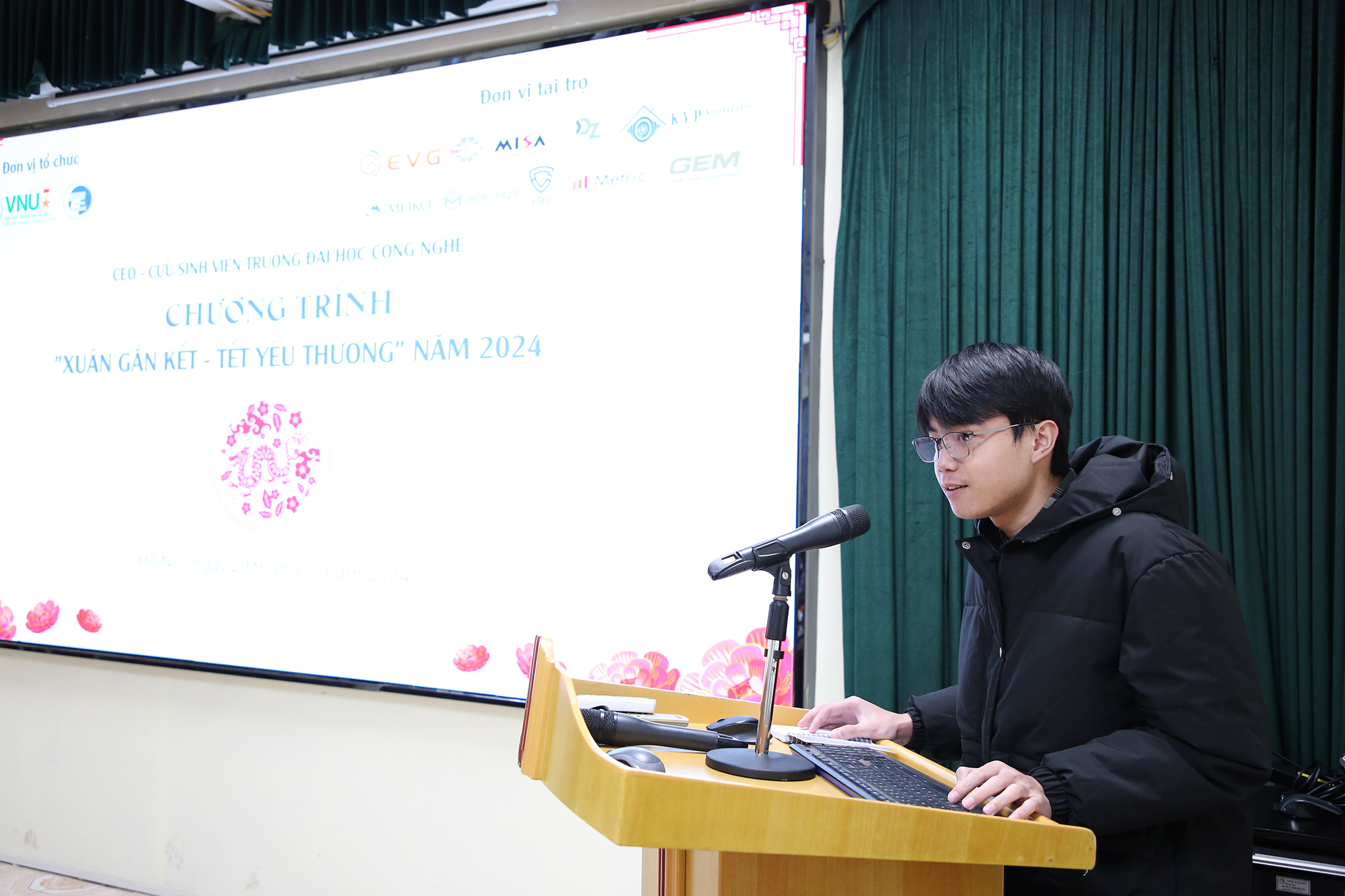 Tại chương trình, các CEO đã trao quà cho 86 sinh viên trong đó có 6 sinh viên quốc tế đang học tập tại Trường đến từ Lào, Hàn Quốc cùng 80 sinh viên có hoàn cảnh khó khăn nhưng vươn lên trong học tập, nghiên cứu. Đại diện cho các sinh viên nhận quà Tết, sinh viên Lường Văn Vinh, QH -2020-I/CQ, ngành Công nghệ thông tin cảm thấy xúc động và bất ngờ đối với hoạt động “Xuân gắn kết – Tết yêu thương” được tổ chức bởi Nhà trường và cựu sinh viên. Đây là hoạt động vô cùng ý nghĩa đối với bản thân Vinh nói riêng và các bạn sinh viên nói chung. Văn Vinh cùng các bạn luôn cảm thấy ấm áp khi có sự sẻ chia của Nhà trường mỗi khi dịp Tết đến, xuân về. Những tình cảm này là động lực giúp Vinh cùng các bạn vững bước trên hành trình chinh phục ước mơ của bản thân.