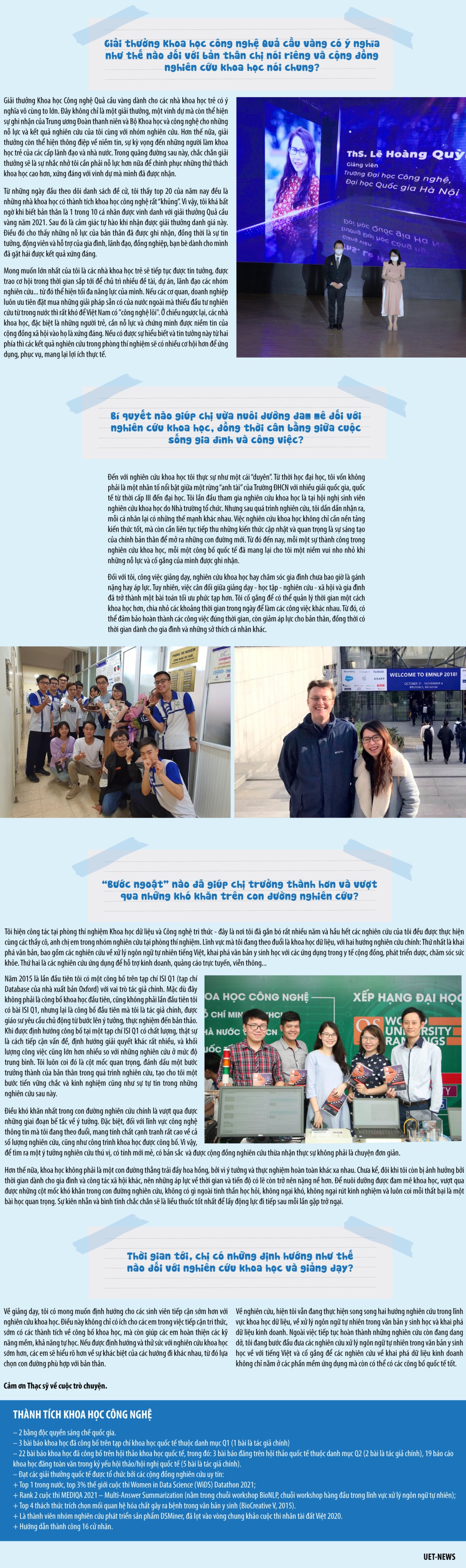 Với những thành tích trong nghiên cứu khoa học và đào tạo, giảng viên trẻ ThS. Lê Hoàng Quỳnh (khoa Công nghệ thông tin) của Trường Đại học Công nghệ, Đại học Quốc gia Hà Nội là 1 trong 10 cá nhân xuất sắc đạt Giải thưởng Khoa học công nghệ thanh niên Quả cầu vàng năm 2021.