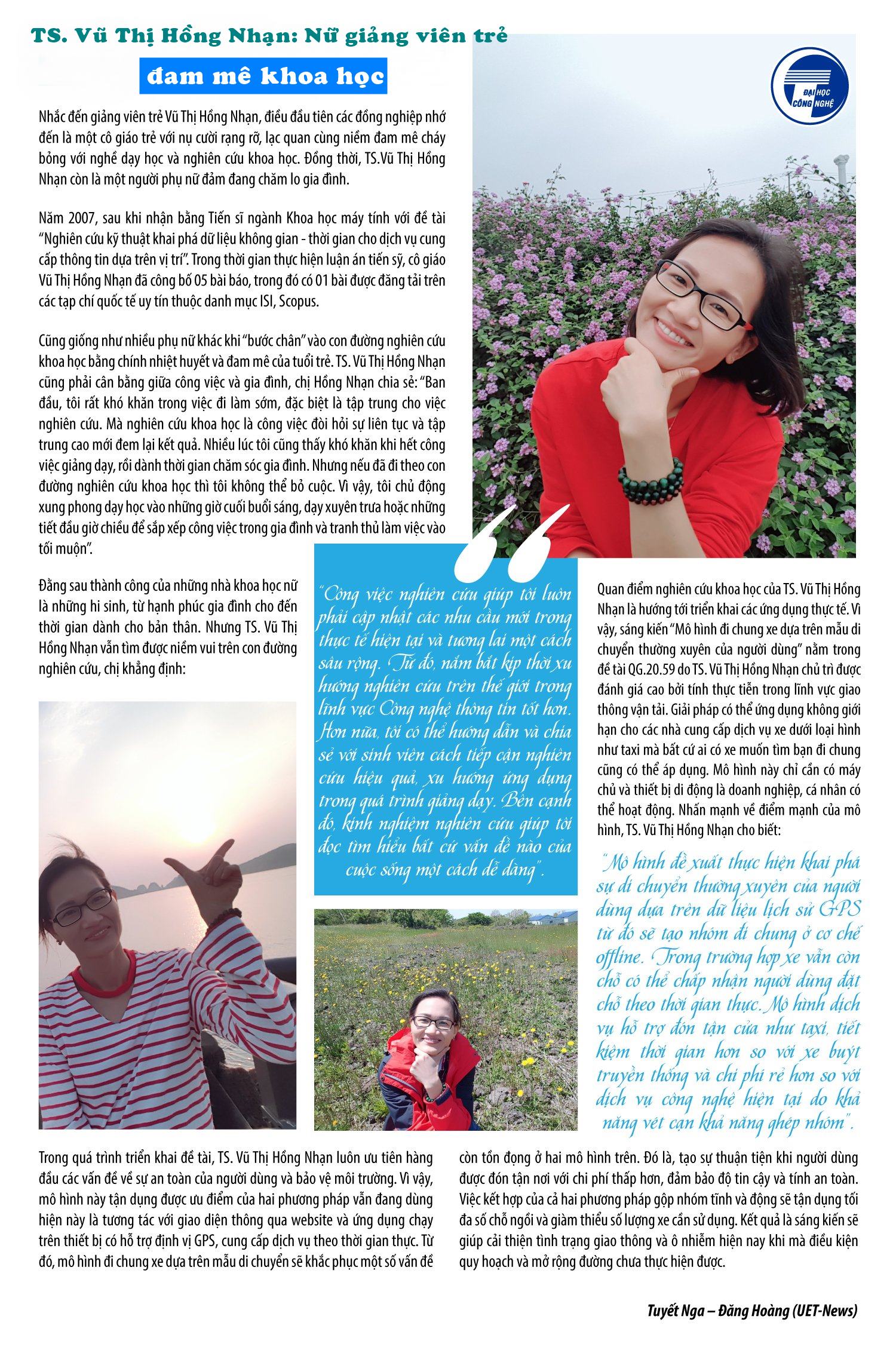 TS. Vũ Thị Hồng Nhạn là một trong những nữ giảng viên trẻ khoa Công nghệ thông tin (Trường Đại học Công nghệ, Đại học Quốc gia Hà Nội) với nhiều thành tích trong đào tạo và nghiên cứu khoa học, đã đạt danh hiệu Chiến sĩ thi đua cấp ĐHQGHN năm học 2020-2021.