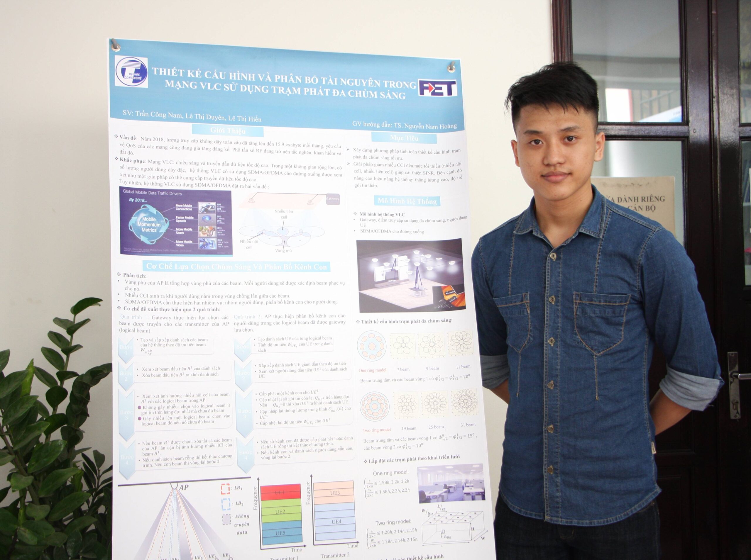 Chia sẻ về việc nghiên cứu, Trần Công Nam cho biết đề tài đưa ra được các đề xuất thiết kế cấu hình mạng VLC truyền dẫn tốc độ cao và một giải pháp giảm thiểu CCI nâng cao hiệu năng hệ thống. Bên cạnh đó, xây dựng hoàn thiện phần mềm mô phỏng mô hình mạng VLC, từ đó có thể phục vụ các nghiên cứu trong tương lai và áp dụng vào xây dựng triển khai cấu hình mạng VLC trong thực tế. Kết quả cuối cùng của đề tài là xây dựng thành công phương pháp tính toán và cấu hình mạng với mục tiêu đạt được hiệu suất quang phổ và tốc độ truyền dữ liệu cao, đảm bảo được các yêu cầu trong hệ thống mạng đa truy cập trong nhà rộng lớn. – Thiết kế cơ chế quản lý tài nguyên với mục tiêu giảm thiểu nhiễu CCI cũng như nâng cao hiệu năng hệ thống: thông lượng hệ thống và người dùng cao và độ trễ gói tin thấp.
