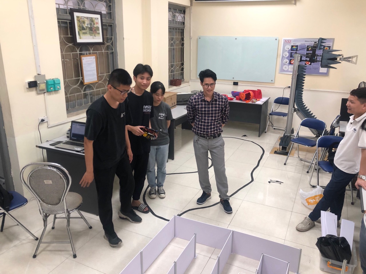 Sinh viên Nguyễn Đức Khánh Huyền – K67 ngành Kỹ thuật Robot – cùng thầy giáo hướng dẫn và các bạn tại Lab Robotics 704 thực hiện các dự án nghiên cứu