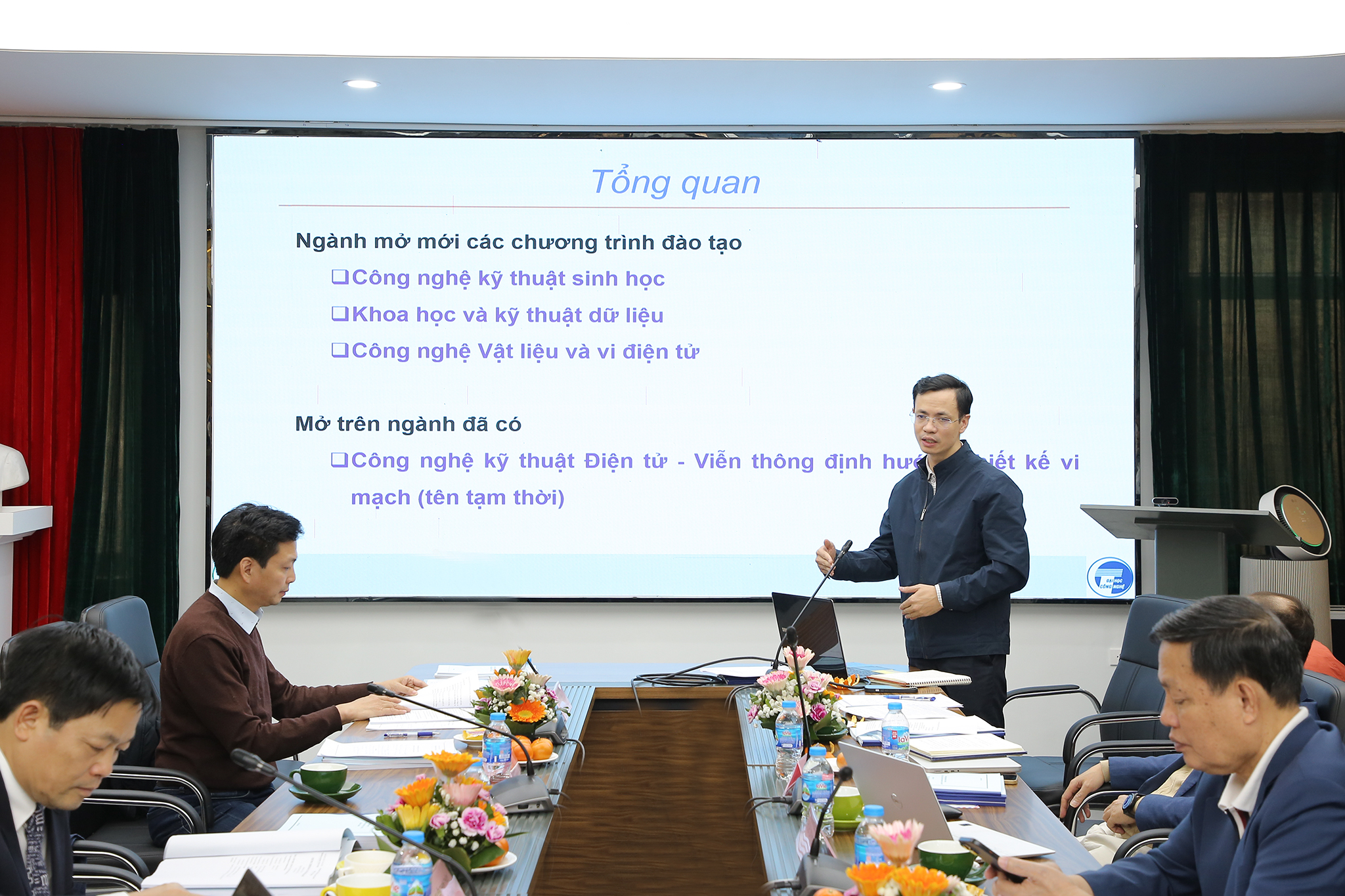 PGS.TS Trần Văn Quảng – Phó Trưởng phòng Đào tạo trình bày nội dung báo cáo về các đề án mở ngành đào tạo Khoa học dữ liệu, Công nghệ sinh học, Công nghệ vật liệu; mở chương trình đào tạo Công nghệ kỹ thuật điện tử – viễn thông định hướng Thiết kế vi mạch
