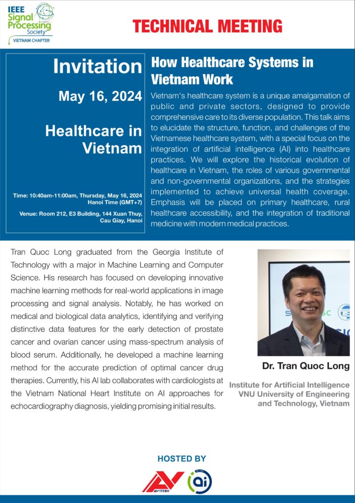 Abstract: Vietnam’s healthcare system is a unique amalgamation of public and private sectors, designed to provide comprehensive care to its diverse population. This talk aims to elucidate the structure, function, and challenges of the Vietnamese healthcare system, with a special focus on the integration of artificial intelligence (AI) into healthcare practices. We will explore the historical evolution of healthcare in Vietnam, the roles of various governmental and non-governmental organizations, and the strategies implemented to achieve universal health coverage. Emphasis will be placed on primary healthcare, rural healthcare accessibility, and the integration of traditional medicine with modern medical practices.