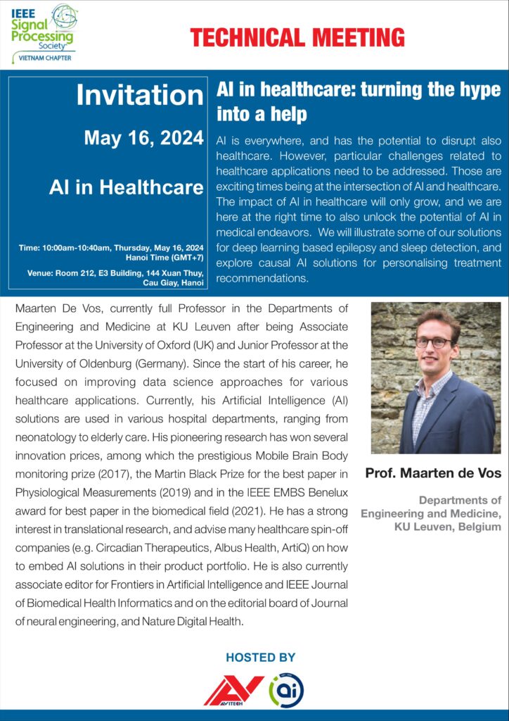 Maarten De Vos, currently full Professor in the Departments of Engineering and Medicine at KU Leuven after being Associate Professor at the University of Oxford (UK) and Junior Professor at the University of Oldenburg (Germany). Since the start of his career, he focused on improving data science approaches for various healthcare applications. Currently, his Artificial Intelligence (AI) solutions are used in various hospital departments, ranging from neonatology to elderly care. His pioneering research has won several innovation prizes, among which the prestigious Mobile Brain Body monitoring prize (2017), the Martin Black Prize for the best paper in Physiological Measurements (2019) and in the IEEE EMBS Benelux award for best paper in the biomedical field (2021). He has a strong interest in translational research, and advises many healthcare spin-off companies (e.g. Circadian Therapeutics, Albus Health, ArtiQ) on how to embed AI solutions in their product portfolio. He is also currently associate editor for Frontiers in Artificial Intelligence and IEEE Journal of Biomedical Health Informatics and on the editorial board of Journal of neural engineering, and Nature Digital Health.