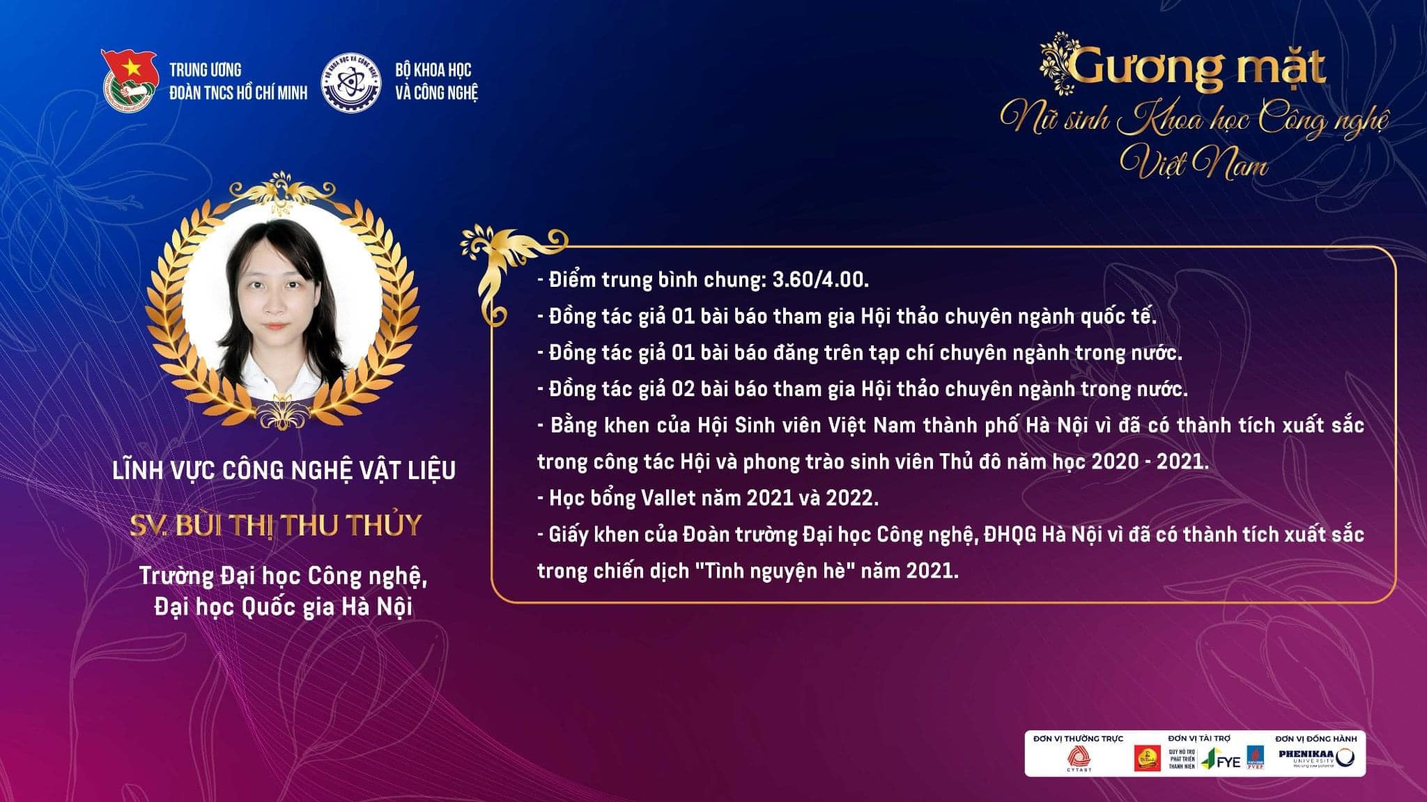 Từ 70 hồ sơ đăng ký trên 11 ngành trong lĩnh vực khoa học và công nghệ gửi hồ sơ tham dự, Trung ương Đoàn TNCS Hồ Chí Minh và Bộ Khoa học và Công nghệ đã lựa chọn 20 gương mặt nữ sinh viên tài năng để trao Phần thưởng Nữ sinh viên tiêu biểu trong lĩnh vực khoa học và công nghệ năm 2022. Trong đó, nữ sinh Khoa Vật lý kỹ thuật và công nghệ nano Bùi Thị Thu Thủy (Trường Đại học Công nghệ – Đại học Quốc gia Hà Nội) nằm trong danh sách 20 cá nhân được nhận Phần thưởng này.