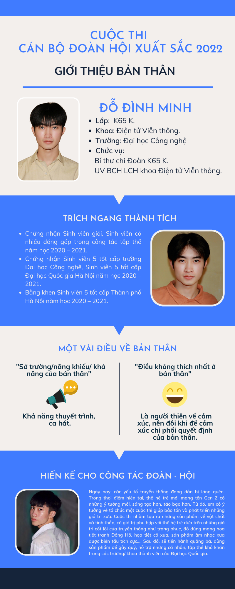 Trong đó, sinh viên Đỗ Đình Minh (Khoa Điện tử Viễn thông, Trường Đại học Công nghệ) là 1 trong 12 thí sinh sẽ có mặt tại chung kết Cuộc thi “Cán bộ Đoàn – Hội xuất sắc” năm 2022.