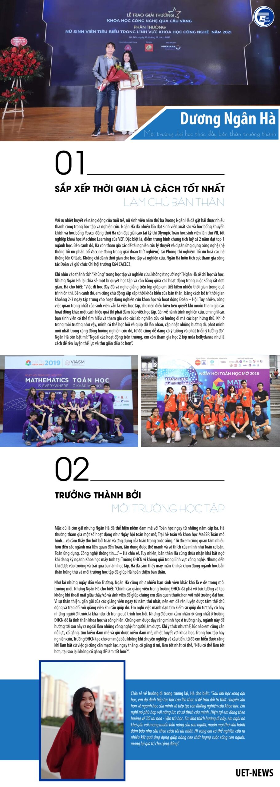 Nữ sinh viên Dương Ngân Hà (Trường Đại học Công nghệ, Đại học Quốc gia Hà Nội) là một trong 20 gương mặt đạt giải thưởng Nữ sinh viên tiêu biểu trong lĩnh vực khoa học và công nghệ năm 2021.
