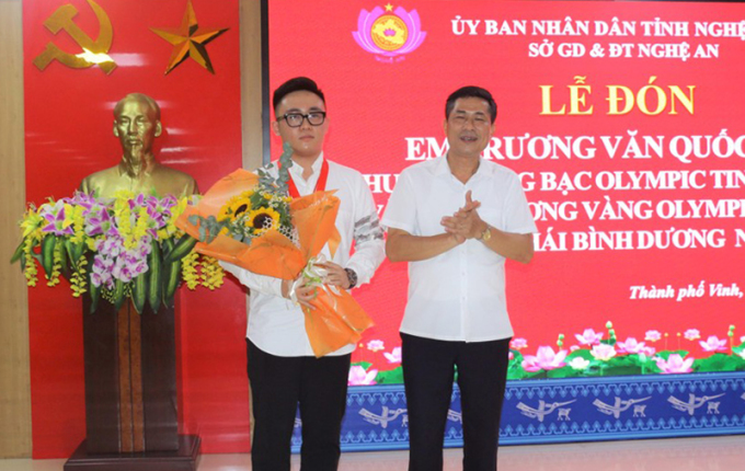 Bảo nhận hoa chức mừng từ Giám đốc Sở Giáo dục và Đào tạo Nghệ An tại lễ đón sau khi đạt giải. Ảnh: Hải Bình