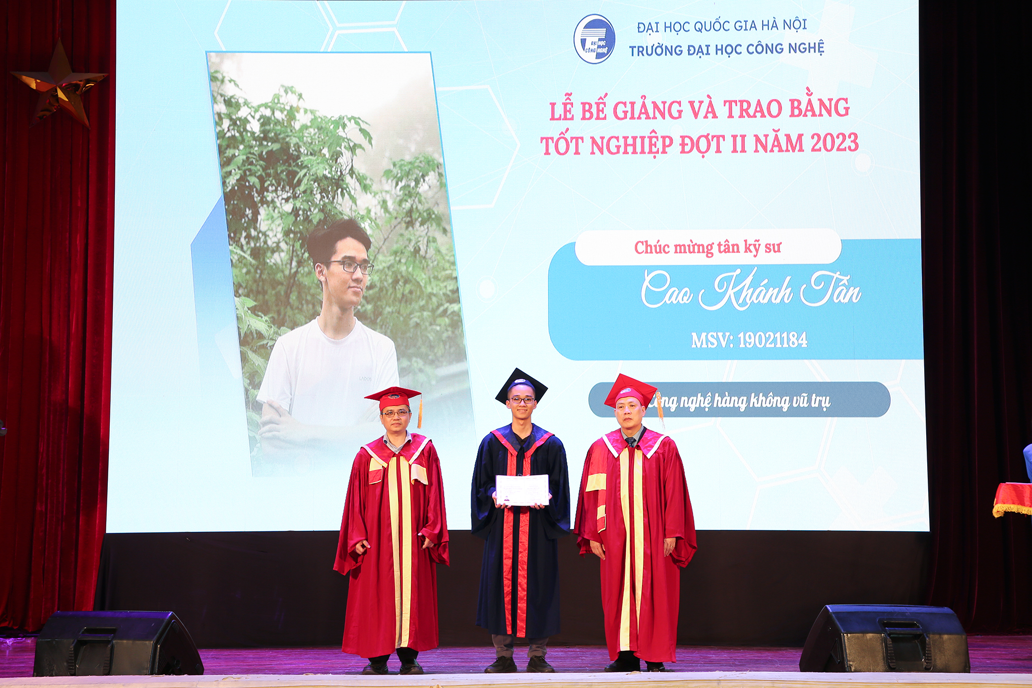 3 sinh viên khóa QH – 2019-I/CQ ngành Công nghệ Hàng không Vũ trụ tại Lễ trao bằng tốt nghiệp ngày 20/01/2024. (Ảnh từ trái sang: Cao Khánh Tân, Trần Thị Thanh Huyền, Nguyễn Tiến Đạt)
