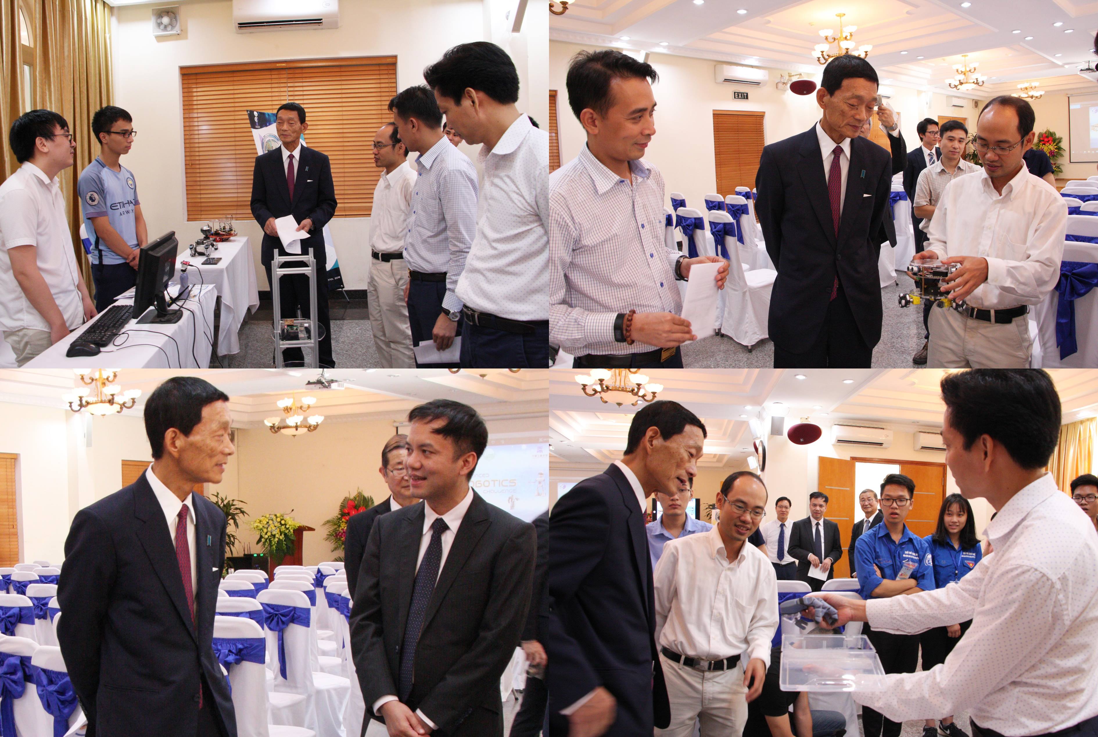 Ông Setokuma Osamu tham quan các sản phẩm robot do cán bộ, sinh viên nghiên cứu và thực hiện