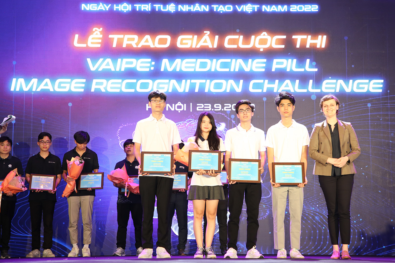 Nhóm Pill Gates (từ trái sang: Phạm Gia Linh, Bùi Khánh Huyền, Phạm Hoàng Hải, Phạm Tiến Du) đạt giải Nhất cuộc thi “VAIPE: Medicine Pill Image Recognition Challenge” tìm kiếm các thuật toán AI nhận dạng chính xác tên các loại thuốc uống từ hình ảnh viên thuốc