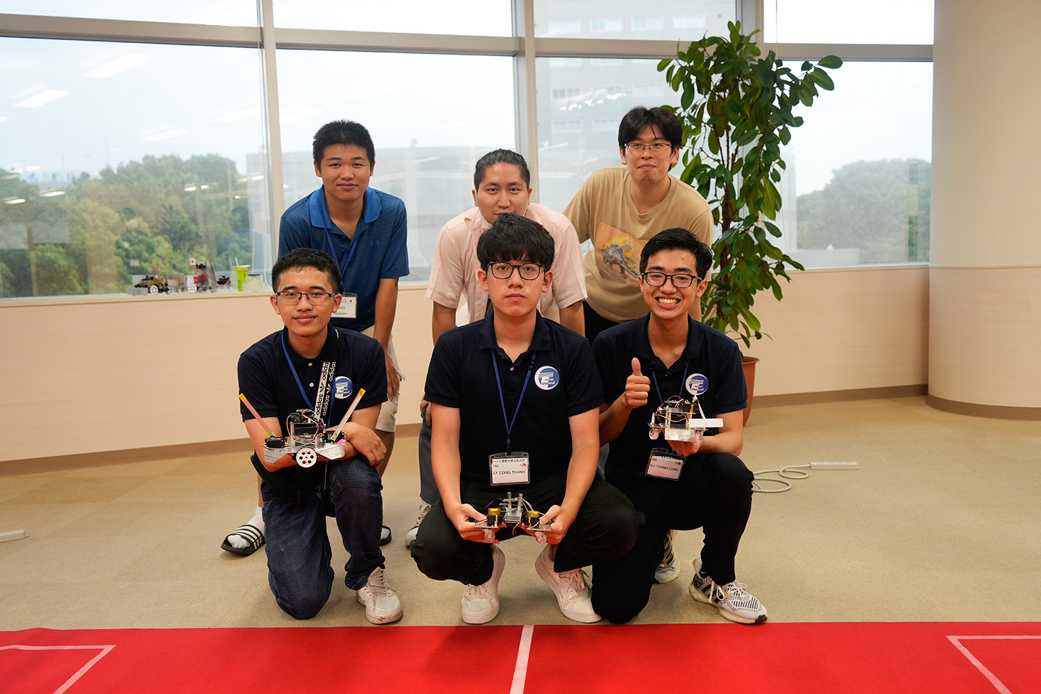 Vũ Thành Long (hàng dưới, ngoài cùng bên phải) cùng nhóm sinh viên đạt giải Nhất cuộc thi thiết kế, chế tạo robot tại Trường ĐH Chiba