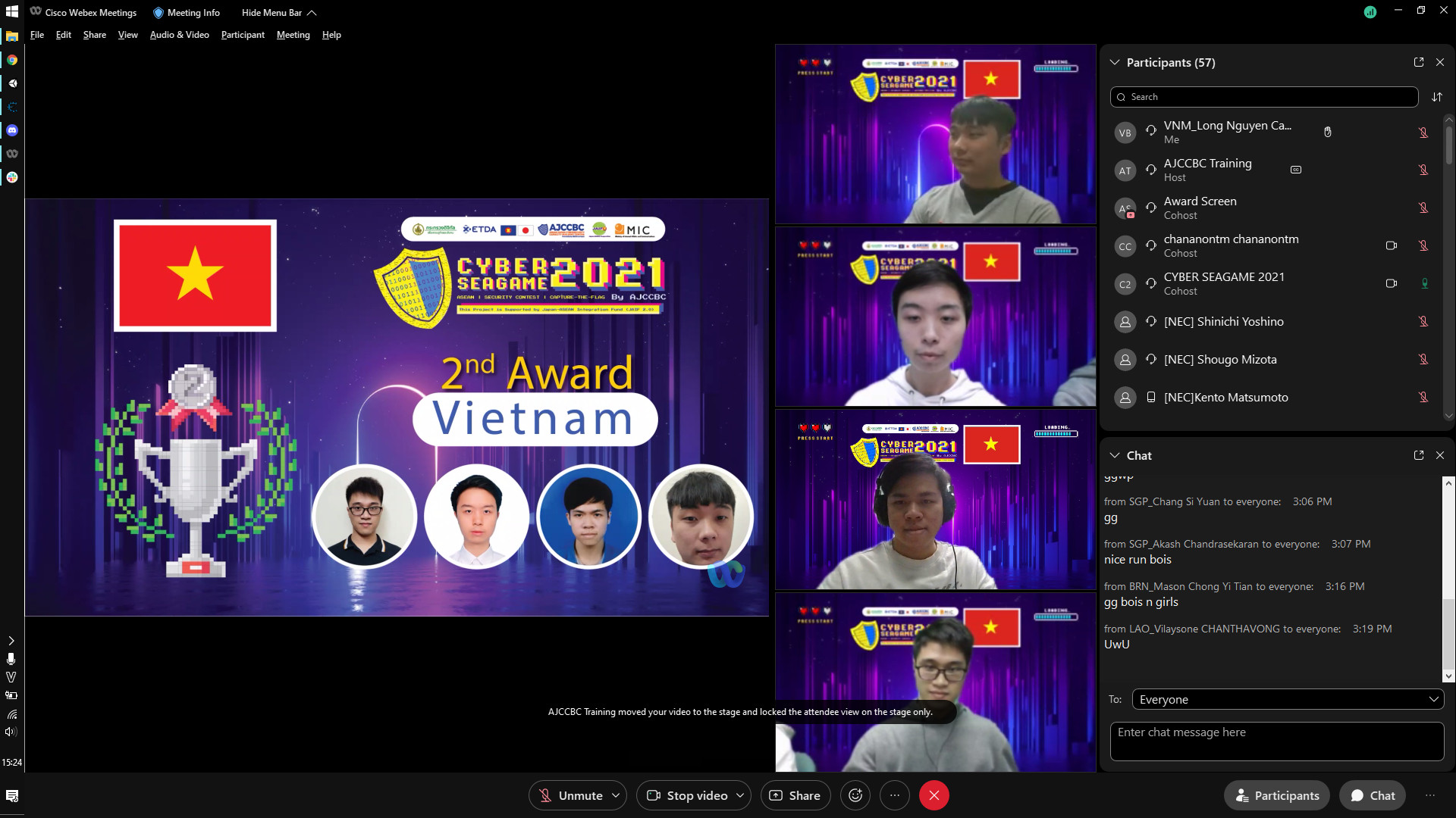 Với Pawsitive – tân Á quân cuộc thi Cyber SEA Game, trong khuôn khổ Hội thảo – Triển lãm quốc tế Ngày An toàn thông tin Việt Nam 2021 diễn ra ngày 25/11, đội thi đã được trao tặng Bằng khen của Bộ trưởng Bộ GD&ĐT vì có thành tích xuất sắc, đạt giải Nhất cuộc thi Sinh viên với An toàn thông tin ASEAN 2021.