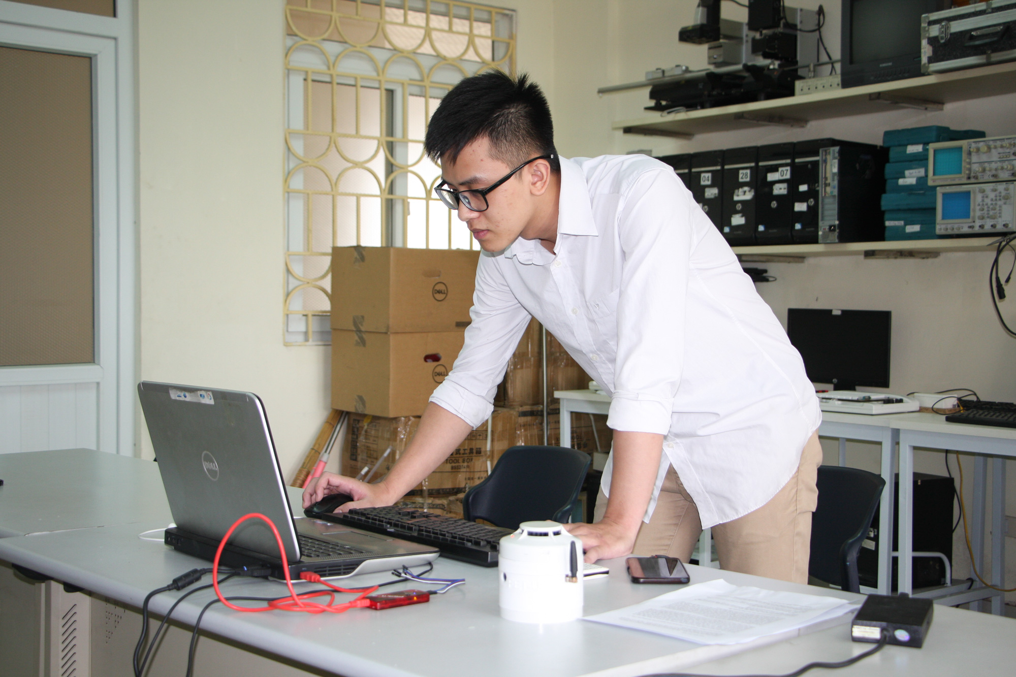 Lê Đức Kiên là sinh viên K62M4, ngành công nghệ Kỹ thuật Cơ Điện Tử, Khoa Cơ Học Kỹ thuật điều khiển & Tự động hóa, trường ĐH Công nghệ. Ngay từ đầu năm 2 Kiên đã lên LAB tham gia nghiên cứu đề tài: “Ứng dụng công nghệ IoT cho hệ thống báo cháy”.