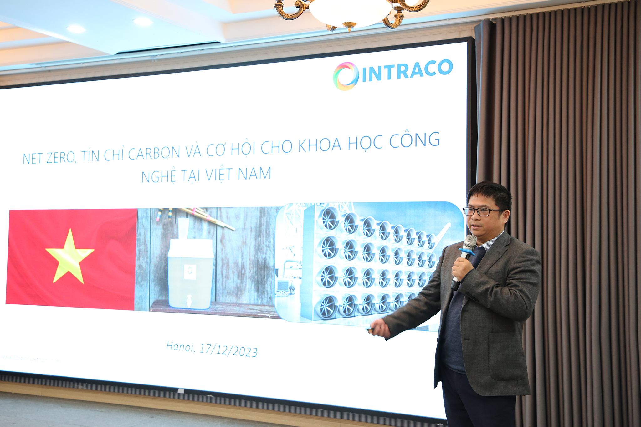 Ông Hoàng Anh Dũng – Sáng lập Công ty TNHH Tư vấn đầu tư và Thương mại (INTRACO) trình bày về “Net Zero , tín chỉ Carbon và cơ hội cho khoa học công nghệ tại Việt Nam”