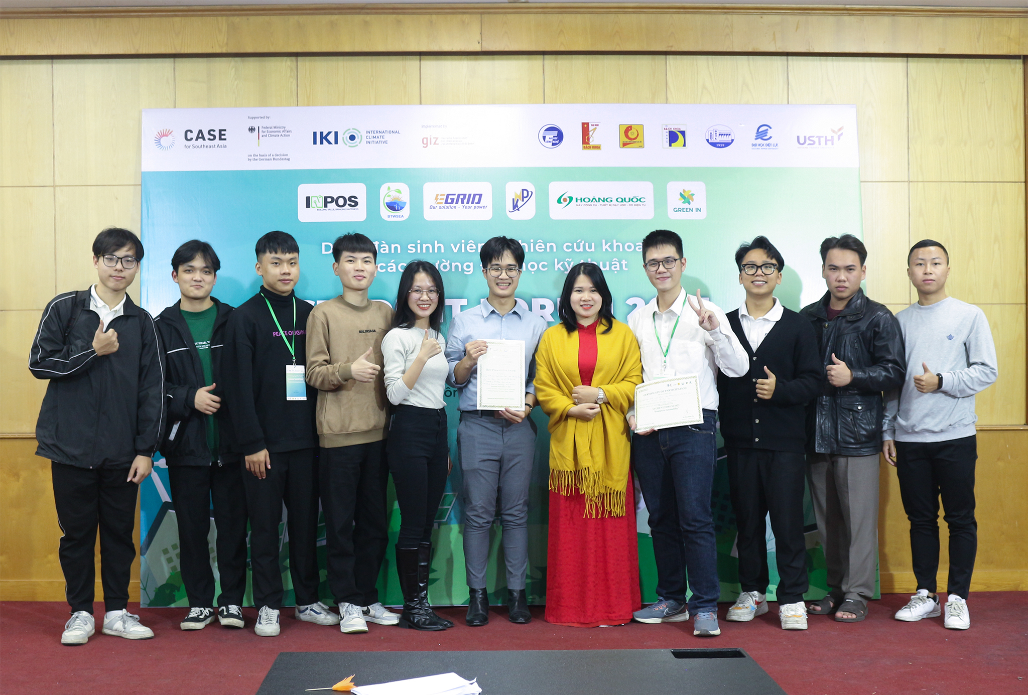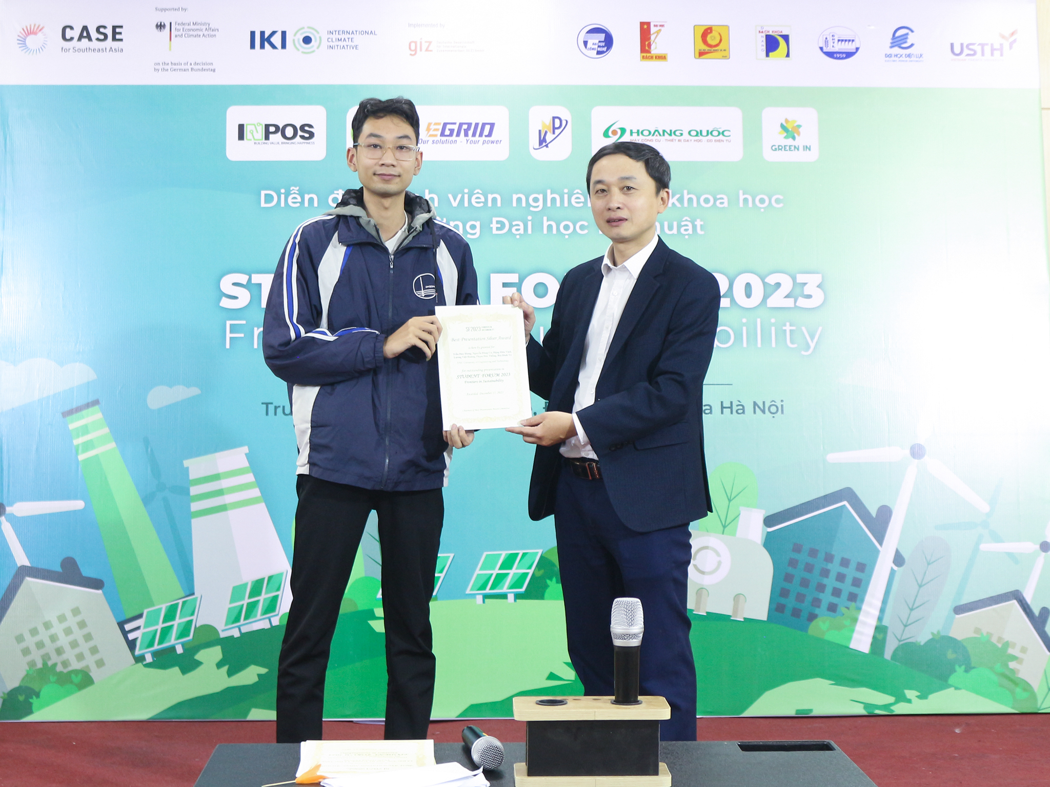 Tại Diễn đàn SF 2023, nhóm sinh viên khoa Vật lý kỹ thuật và công nghệ nano, Trường ĐH Công nghệ gồm sinh viên ngành Vật lý kỹ thuật là Trần Duy Hưng (K64), Lương Việt Hoàng (K65) và sinh viên ngành Kỹ thuật năng lượng Đặng Hữu Vinh (K66), với báo cáo: “Nghiên cứu cải thiện tính chất từ tính và điện môi của vật liệu tổ hợp (1-x)Bi0.5(Na0.8K0.2)0.5TiO3 – xFe3O4 ứng dụng trong tụ điện gốm” đã xuất sắc vượt qua các đề tài tham dự và đạt giải Nhì dành cho báo cáo Trình bày xuất sắc nhất.