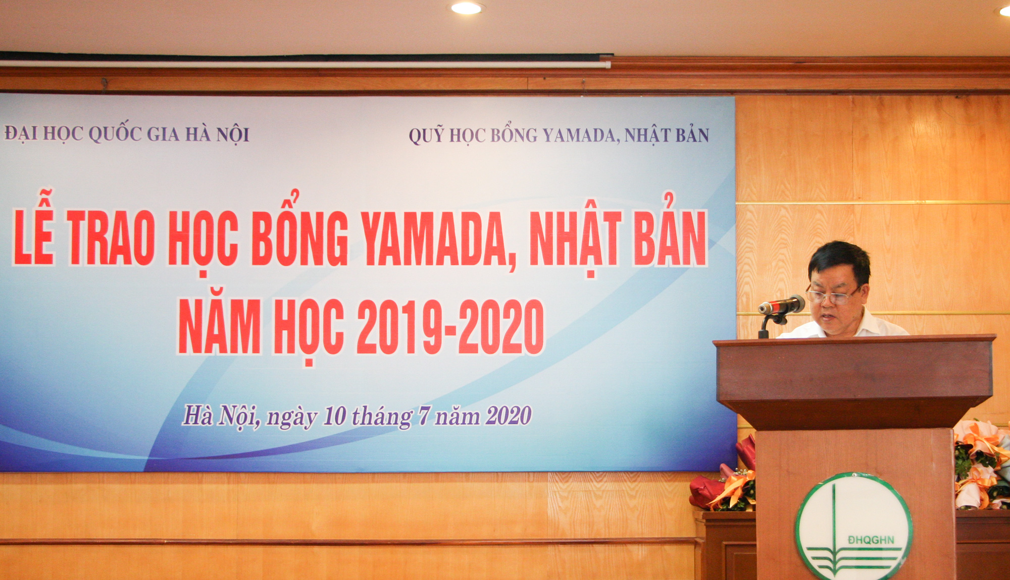 Tại buổi lễ, PGS.TS Đinh Văn Hường – Trưởng Ban Chính trị và Công tác Học sinh sinh viên, đã gửi lời chúc mừng đến 50 bạn sinh viên xuất sắc được nhận học bổng Yamada, ĐHQGHN đánh giá cao giá trị nhân văn và ý nghĩa thực tiễn mà Quỹ học bổng quốc tế Yamada, Nhật Bản, đặc biệt là trong thời điểm diễn ra dịch bệnh Covid-2019. PGS hi vọng các em sinh viên sẽ tiếp tục phát huy những thế mạnh trong đào tạo, nghiên cứu khoa học và khát vọng tuổi trẻ để trở thành những công dân có ích. Đồng thời, các em sẽ trở thành những cầu nối cho mối quan hệ tốt đẹp giữa Việt Nam và Nhật Bản. PGS còn thể hiện sự tin tưởng rằng chương trình học bổng Yamada sẽ tiếp tục được duy trì, phát triển thường xuyên trong những năm tới, góp phần tăng cường mối quan hệ hợp tác hiệu quả bền vững và tốt đẹp giữa ĐHQGHN với Quỹ học bổng quốc tế Yamada, Nhật Bản.