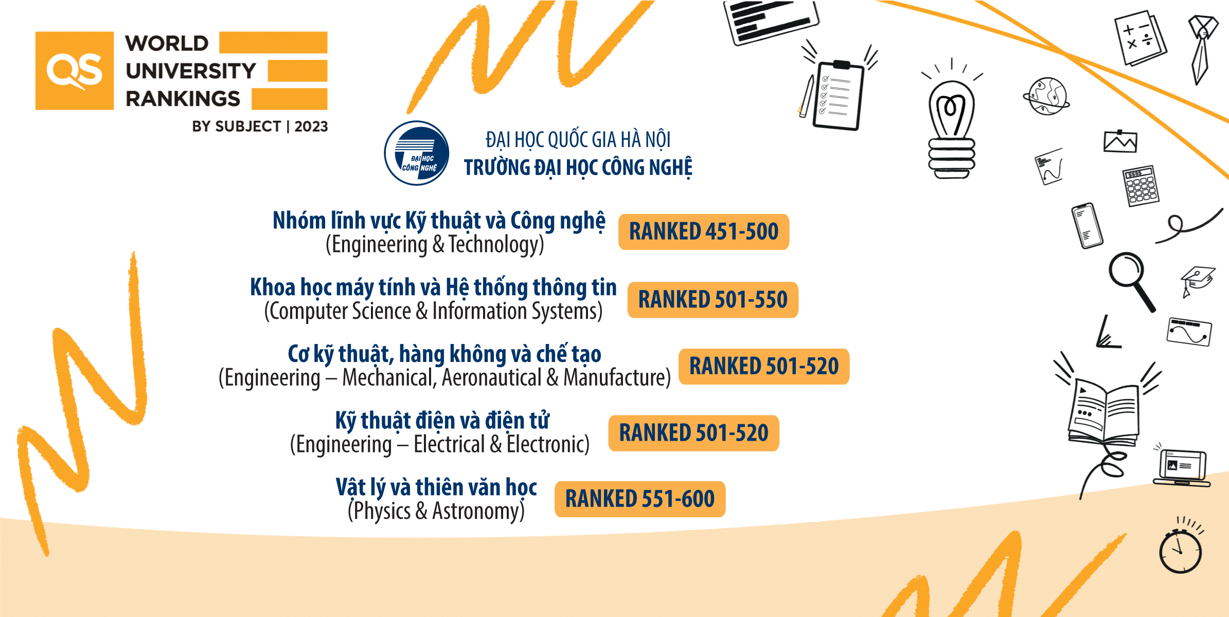 Trường ĐH Công nghệ tiếp tục khẳng định vị thế trên các bảng xếp hạng đại học thế giới.Năm 2023, 6 lĩnh vực của ĐHQGHN tiếp tục được xếp hạng bởi QS Rankings, trong đó có 4 lĩnh vực thuộc sự quản lý, đào tạo của Trường Đại học Công nghệ đó là: Nhóm lĩnh vực Kỹ thuật và Công nghệ (Engineering & Technology) top 451-500 thế giới; Khoa học máy tính và Hệ thống thông tin (Computer Science & Information Systems) top 501-550 thế giới; Cơ kỹ thuật, hàng không và chế tạo (Engineering – Mechanical, Aeronautical & Manufacture) top 501-520 thế giới; và Kỹ thuật điện và điện tử (Engineering – Electrical & Electronic) top 501-520 thế giới; Vật lý và thiên văn học (Physics & Astronomy) top 551-600 thế giới.