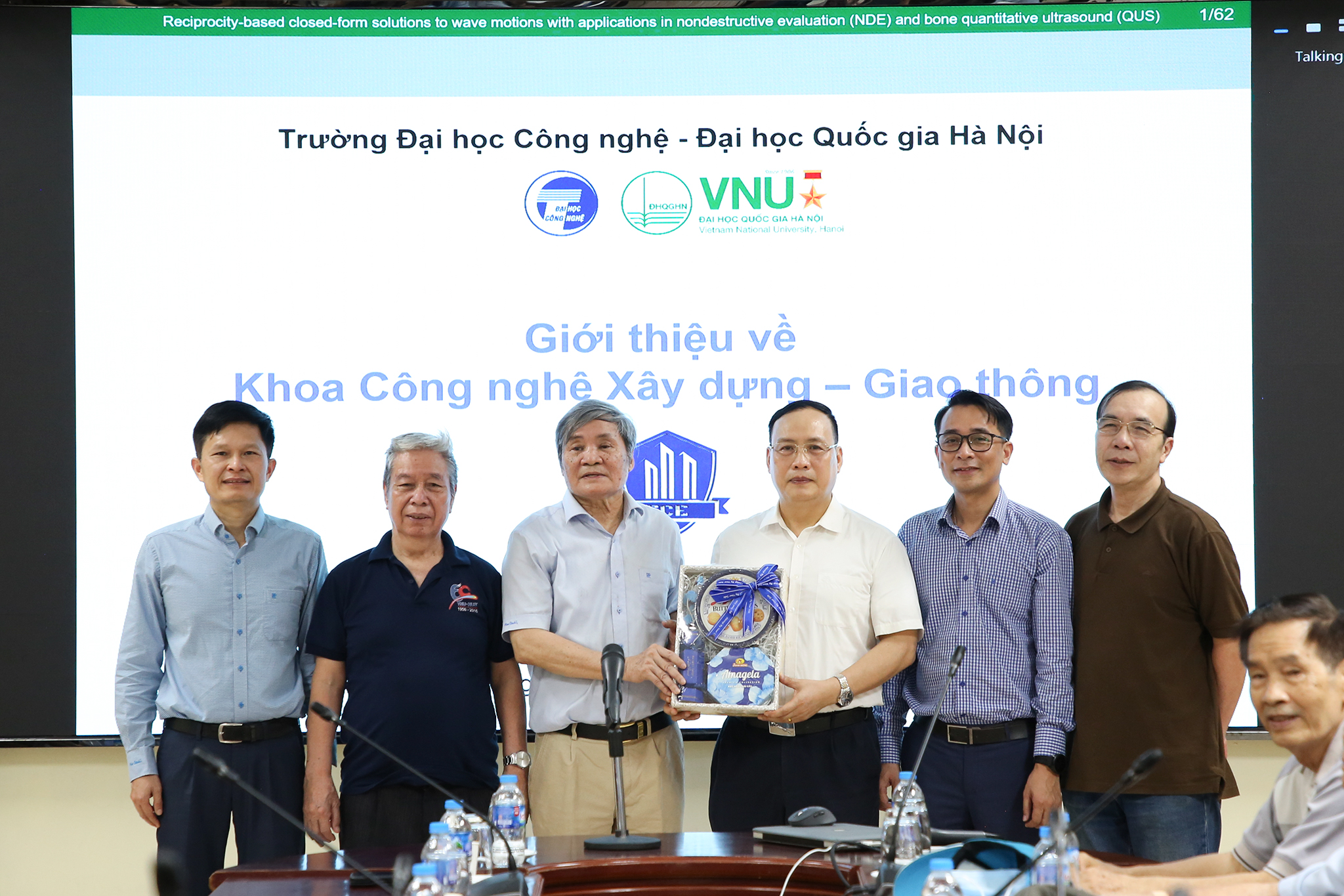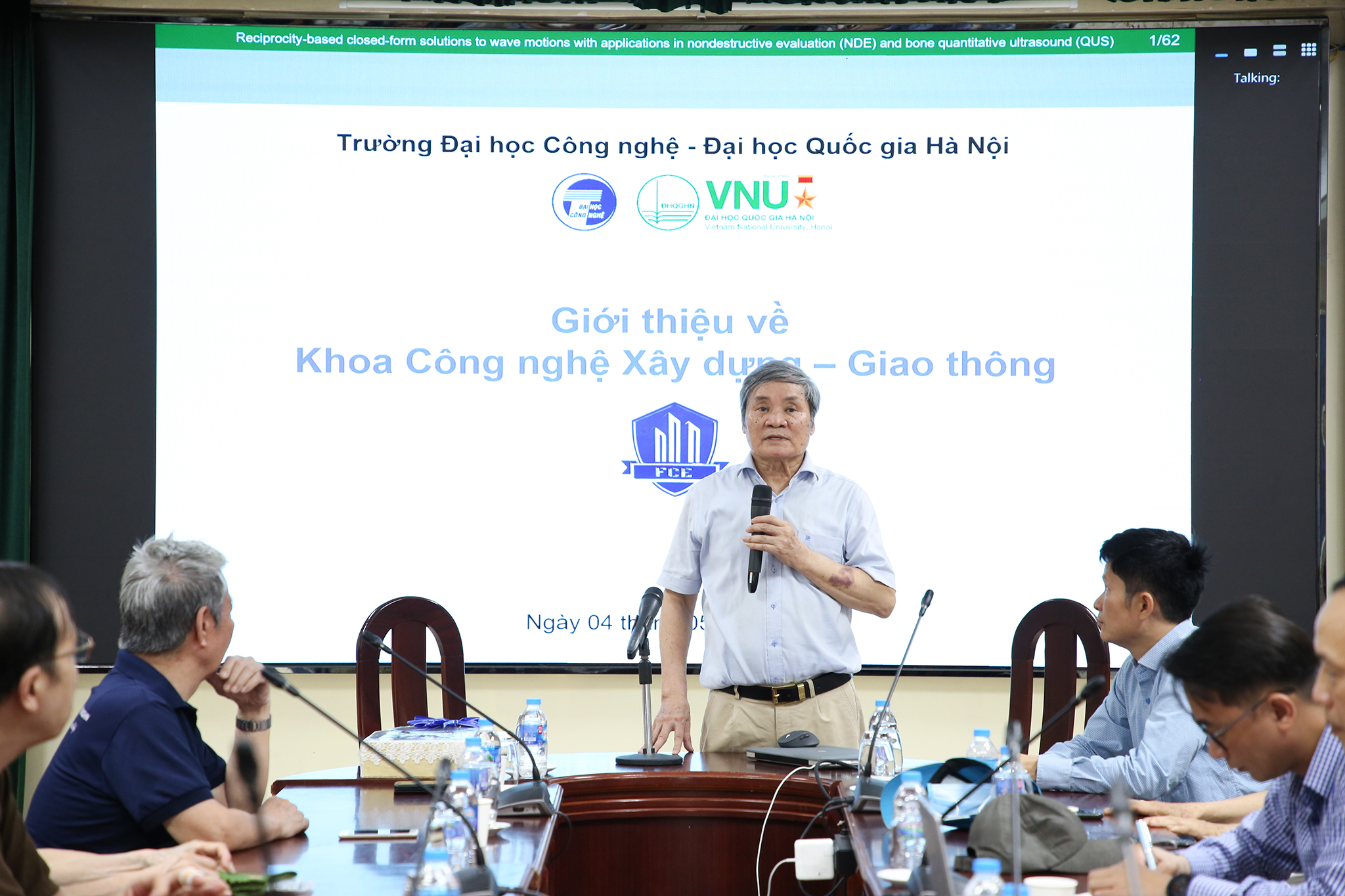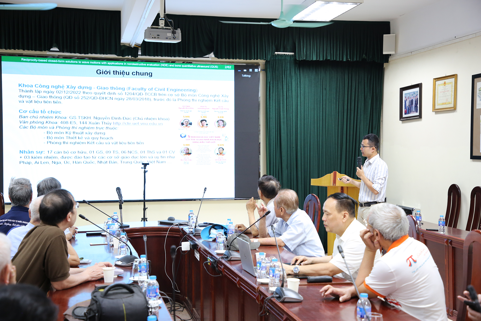 GS.TSKH Nguyễn Đình Đức và TS. Phan Hải Đăng – Khoa Công nghệ Xây dựng – Giao thông đã giới thiệu ngắn gọn về Khoa và trình bày báo cáo “Phương pháp tương hỗ tìm nghiệm đóng bài toán truyền sóng với ứng dụng trong lĩnh vực đánh giá không phá hủy và siêu âm định lượng xương”.