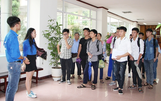 Đội ngũ tình nguyện viên dẫn người nhà và thí sinh thăm quan và tìm hiểu về cơ sở vật chất ở các phòng học, phòng thí nghiệm và phòng ban chức năng của Nhà trường