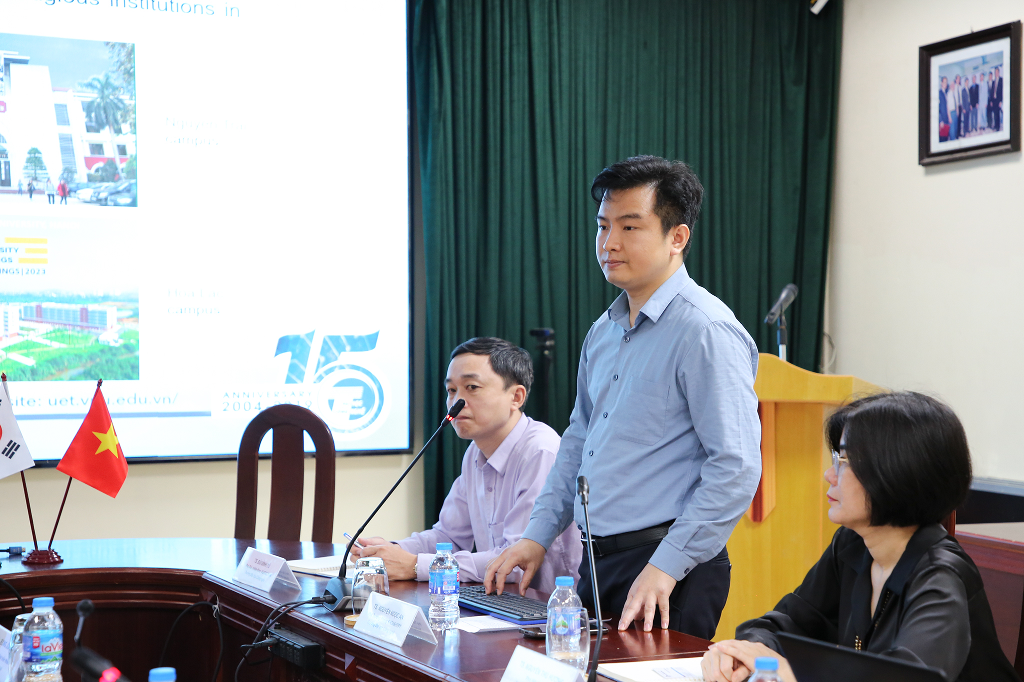 Tại buổi làm việc, TS. Nguyễn Ngọc An – Phó Trưởng phòng Khoa học công nghệ và hợp tác phát triển đã giới thiệu thông tin sơ lược về lịch sử phát triển, cơ cấu tổ chức, chương trình đào tạo đang được giảng dạy tại Trường ĐH Công nghệ. Trường ĐH Công nghệ là một trường những trường đại học kỹ thuật hàng đầu trong hệ thống giáo dục Việt Nam, với việc tập trung đào tạo các chương trình đào tạo đáp ứng nhu cầu xã hội hiện nay như chip bán dẫn, trí tuệ nhân tạo, công nghệ nông nghiệp, công nghệ xây dựng – giao thông….