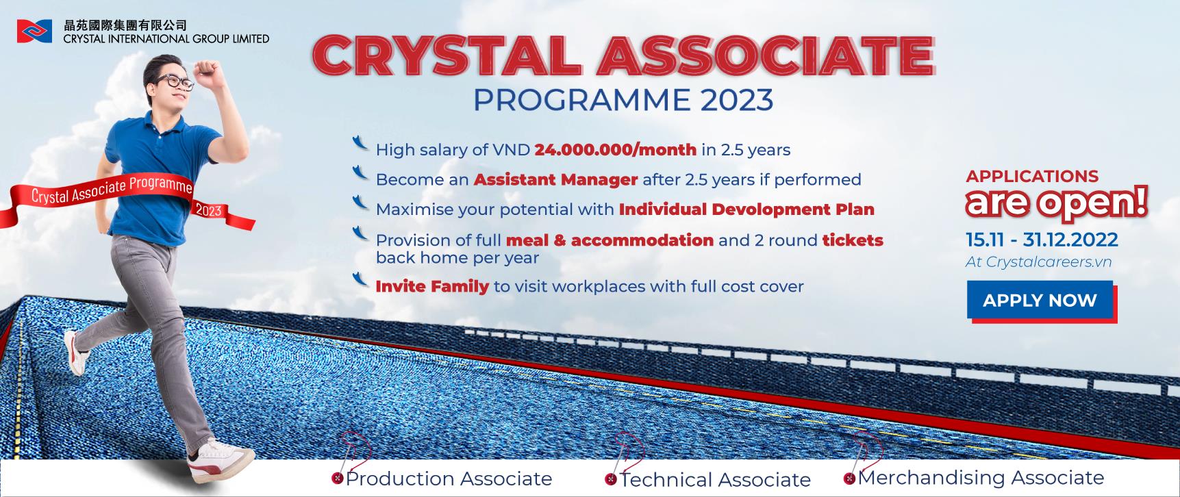 - Sau khi tốt nghiệp Crystal Associate Programme, các Associate tiếp tục có cơ hội tham gia các chương trình phát triển lên các cấp lãnh đạo cao hơn nữa như Factory Talents, Future Leaders,…