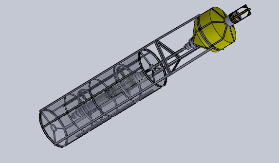 Phao thứ nhất của thiết bị có bán kính phần nổi trên mặt nước đủ lớn để hấp thụ năng lượng sóng tốt và chuyển động cùng mặt sóng, nhưng đủ nhỏ so với bước sóng để đảm bảo nguyên lí hấp thụ điểm. Phao thứ hai có bán kính phần nổi trên mặt nước bé nên hấp thụ năng lượng sóng ít, vì thế có xu hướng đứng im so với mặt sóng và với phao thứ nhất. Ngoài ra để điều chỉnh các đặc trưng dao động của hai phao, tăng hiệu suất của thiết bị, đảm bảo các hoạt động của thiết bị ổn định hơn, thiết bị chuyển đổi năng lượng sóng biển sâu còn được đề xuất bao gồm thêm lồng gia tốc gắn với phao thứ nhất và đĩa gia tốc gắn với phao thứ hai được tính toán và thiết kế hợp lý (Hình 2).