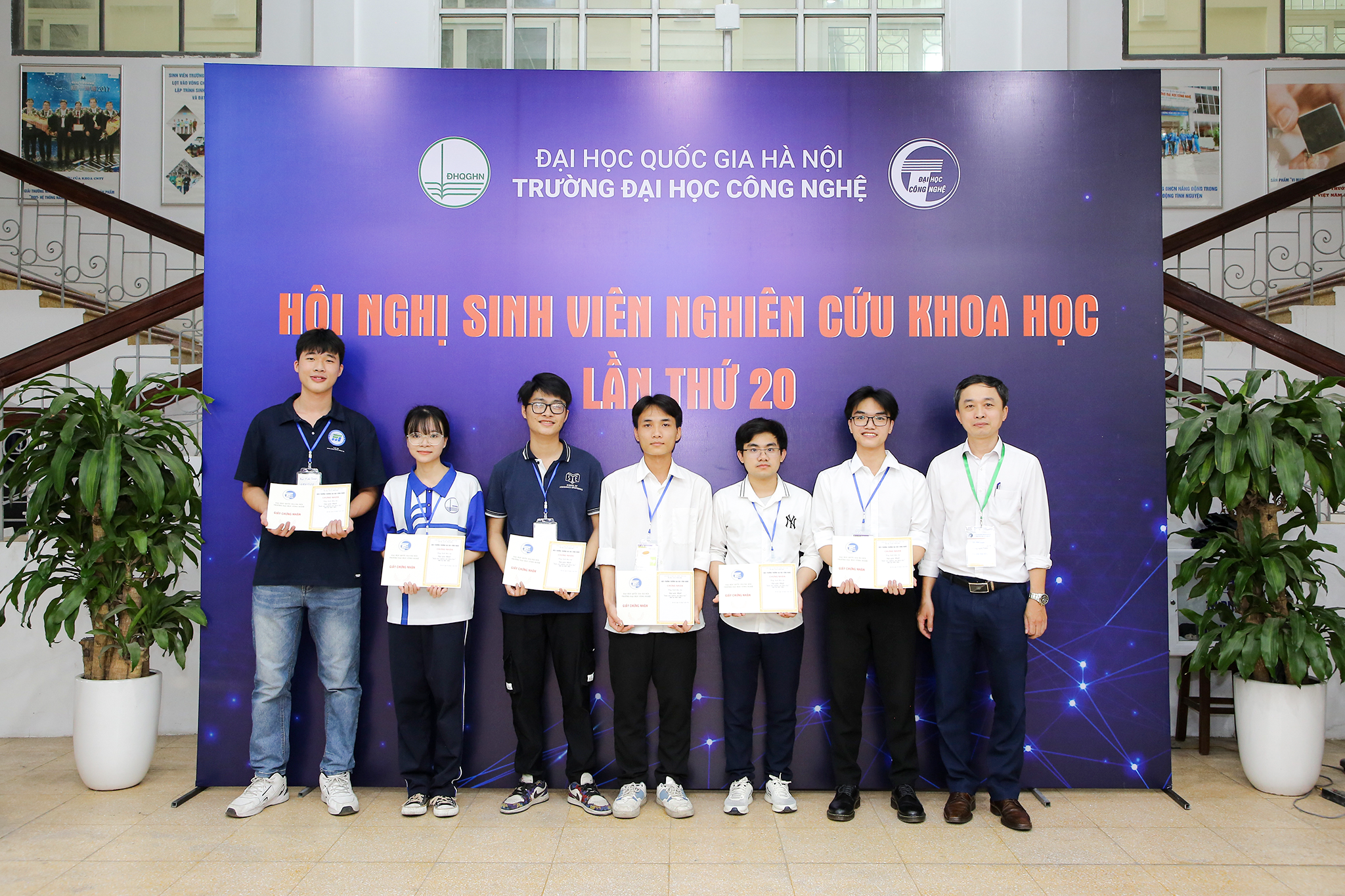 Nhóm nghiên cứu khoa Vật lý kỹ thuật và công nghệ nano đạt giải Nhất (đứng từ thứ 2 đến thứ 4, bên phải ảnh) tại hội nghị sinh viên nghiên cứu khoa học cấp Trường