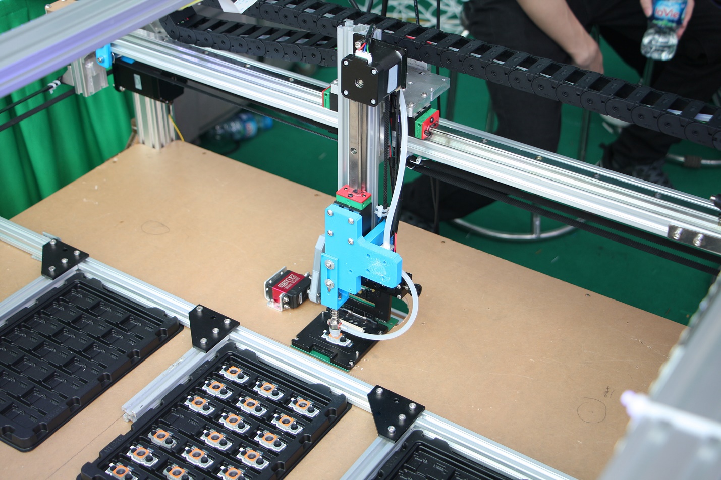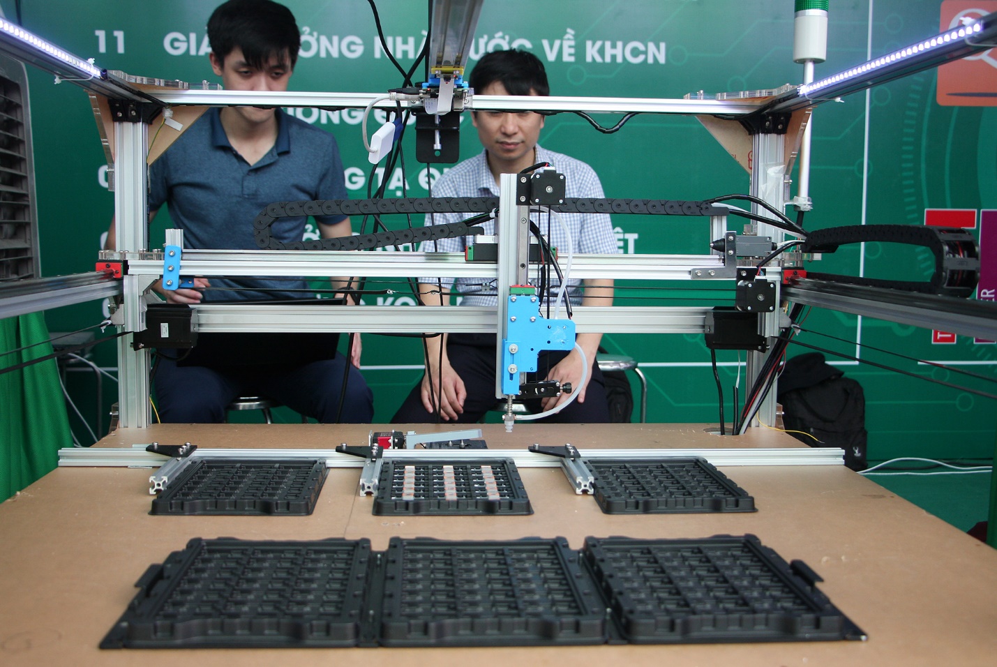 Dựa trên những thế mạnh sẵn có của nhóm nghiên cứu về cơ khí, điều khiển tự động hóa, kỹ thuật cảm biến, lập trình nhúng, lập trình giao diện người dùng và phát triển các sản phẩm định hướng ứng dụng, nguyên mẫu đầu tiên của hệ thống tự động hóa công đoạn kiểm tra linh kiện trong dây chuyền sản xuất đã được nghiên cứu phát triển trong thời gian rất ngắn. Hệ thống này được chế tạo nhằm tự động hóa công đoạn kiểm tra linh kiện cụm camera của điện thoại di động thông minh. Cụm linh kiện camera sau khi được đóng gói thành phẩm và kiểm tra hoạt động các cơ cấu quang học sẽ đến công đoạn kiểm tra hoạt động giao tiếp với bộ nhớ của cụm linh kiện, đảm bảo linh kiện có thể hoạt động không sai sót. Hệ thống bao gồm một tay máy có nhiệm vụ định vị và gắp linh kiện đưa đặt vào vị trí kiểm tra. Hệ thống điện tử giao tiếp kiểm tra các kết nối và hoạt động của bộ nhớ để trả về vị trí phân loại ra các cụm linh kiện đạt được các thông số kỹ thuật theo yêu cầu hay không.