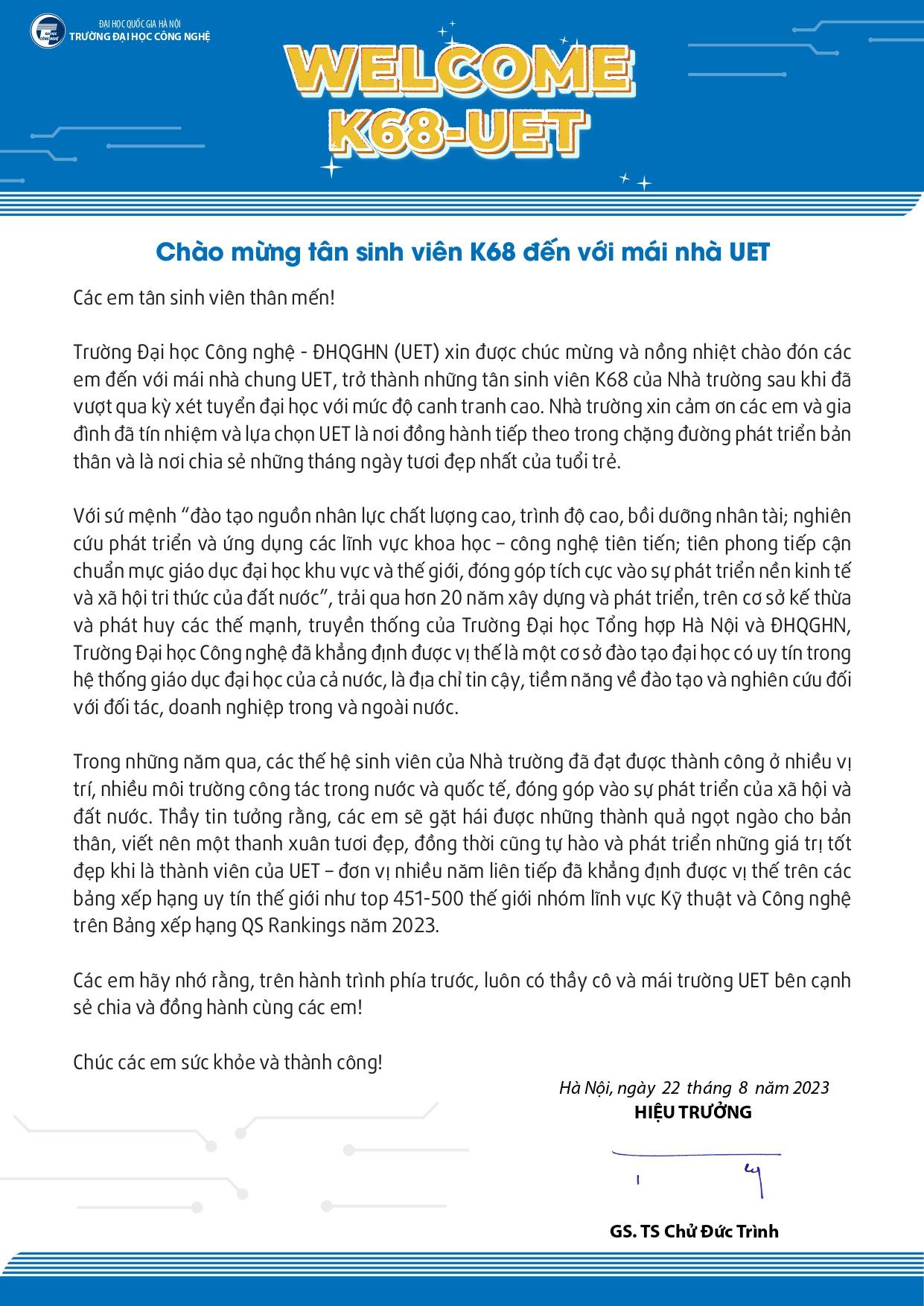Trường Đại học Công nghệ – ĐHQGHN (UET) xin được chúc mừng và nồng nhiệt chào đón các em đến với mái nhà chung UET, trở thành những tân sinh viên K68 của Nhà trường sau khi đã vượt qua kỳ xét tuyển đại học với mức độ canh tranh cao. Nhà trường xin cảm ơn các em và gia đình đã tín nhiệm và lựa chọn UET là nơi đồng hành tiếp theo trong chặng đường phát triển bản thân và là nơi chia sẻ những tháng ngày tươi đẹp nhất của tuổi trẻ.
