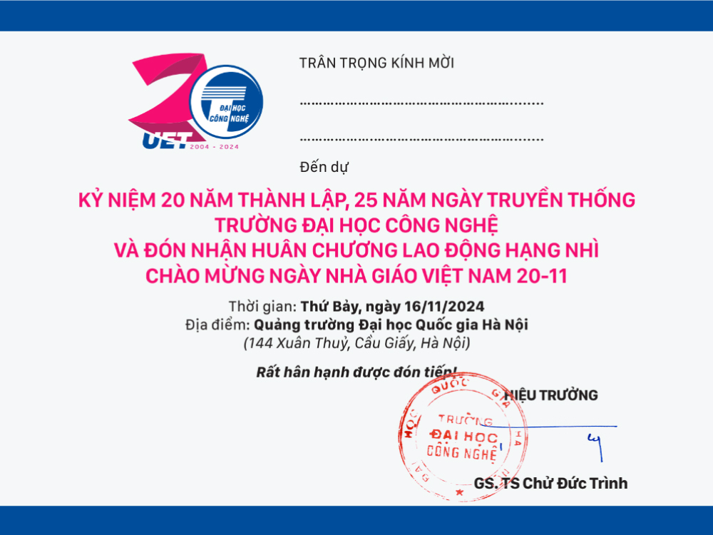 Kính gửi các thế hệ giảng viên, viên chức, người lao động Các thế hệ sinh viên, học viên, nghiên cứu sinh Trường Đại học Công nghệ Trải qua 20 năm hình thành và phát triển (2004 – 2024), Trường Đại học Công nghệ (ĐHCN), ĐHQGHN tự hào đã và đang trở thành một trong những cơ sở giáo dục hàng đầu trong lĩnh vực công nghệ, kỹ thuật tại Việt Nam, một số lĩnh vực được xếp hạng ngang tầm khu vực và thế giới. Với sứ mệnh đào tạo nguồn nhân lực chất lượng cao, bồi dưỡng nhân tài; nghiên cứu phát triển và ứng dụng các lĩnh vực khoa học – công nghệ tiên tiến, Nhà trường không ngừng nỗ lực đổi mới, sáng tạo nhằm kiến tạo những giá trị thiết thực cho xã hội. Trường ĐHCN đạt được các thành tựu và kết quả cho đến hôm nay là nhờ sự quan tâm, chỉ đạo, ủng hộ của lãnh đạo các cấp, của ĐHQGHN, sự đồng hành của các doanh nghiệp, đối tác trong và ngoài nước, đặc biệt là sự đóng góp công sức của các thế hệ lãnh đạo, các thầy cô giáo, viên chức, người lao động, sinh viên, học viên, nghiên cứu sinh của Trường. Nhân dịp này Trường ĐHCN trân trọng kính mời Quý thầy cô, viên chức, người lao động cùng các thế hệ sinh viên, học viên, nghiên cứu sinh tới dự buổi Lễ và hòa nhịp trong niềm vui chung của Trường Đại học Công nghệ. Trân trọng./. CHỬ ĐỨC TRÌNH HIỆU TRƯỞNG |