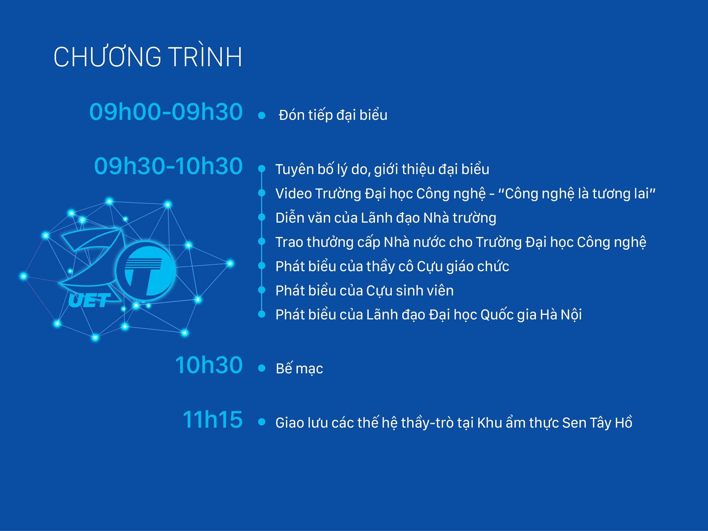 Nhân dịp này, Trường Đại học Công nghệ trân trọng kính mời Quý thầy cô cùng các thế hệ sinh viên, học viên, nghiên cứu sinh tới dự Lễ Kỷ niệm và hòa nhịp trong niềm vui chung của Trường Đại học Công nghệ.