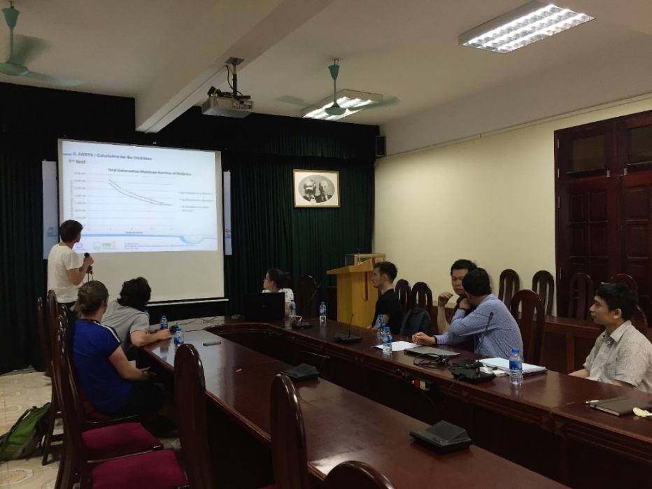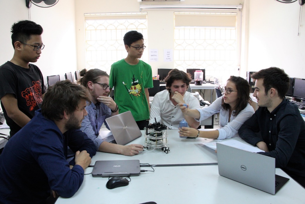 Nhóm sinh viên Pháp và các sinh viên Việt Nam đang trao đổi về thiết kế của thân robot dựa trên mẫu chết thử thu nhỏ