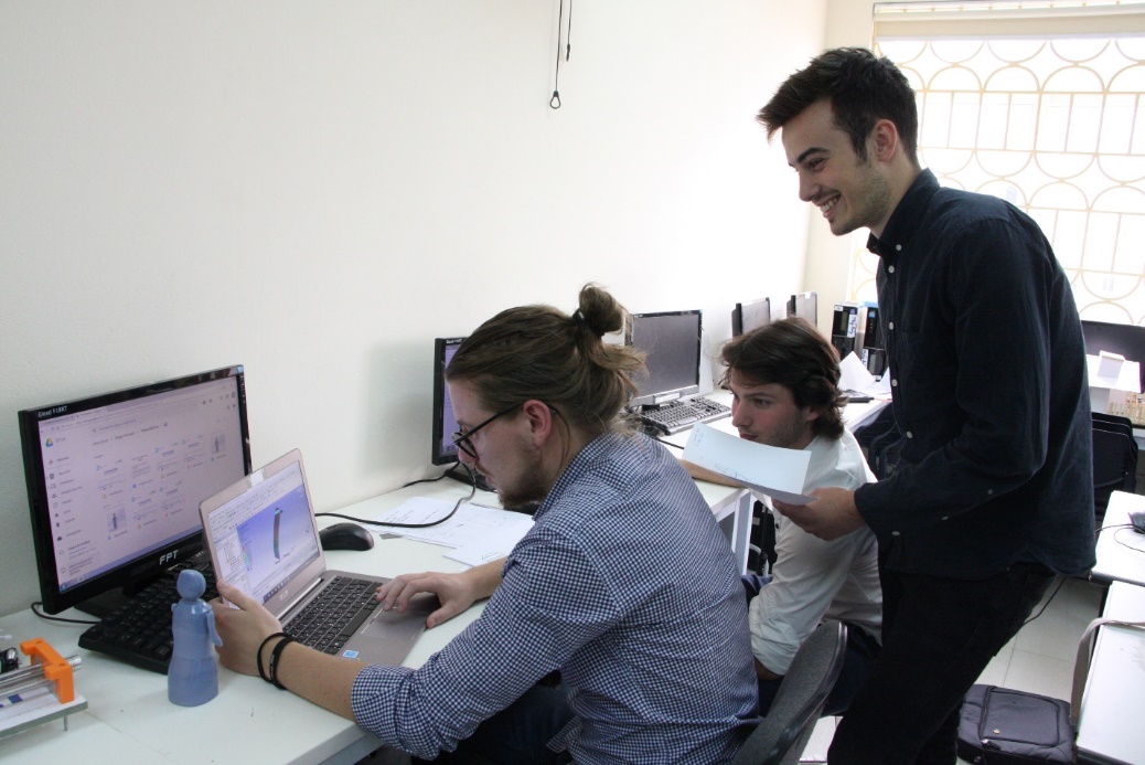 Các sinh viên Pháp đang triển khai bản vẽ vỏ robot đã bàn bạc trên giấy vào phần mềm mô phỏng để khảo sát đặc tính
