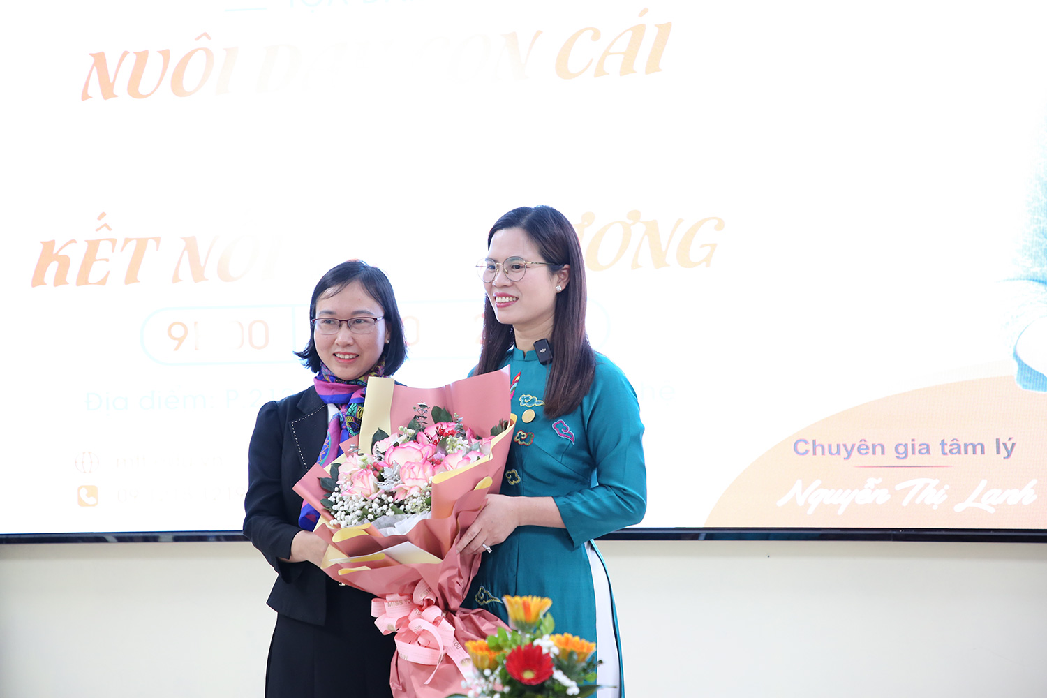 TS. Nguyễn Anh Thái thay mặt Nhà trường tặng hoa cảm ơn buổi trò chuyện, trao đổi của chuyên gia tâm lý Nguyễn Thị Lanh