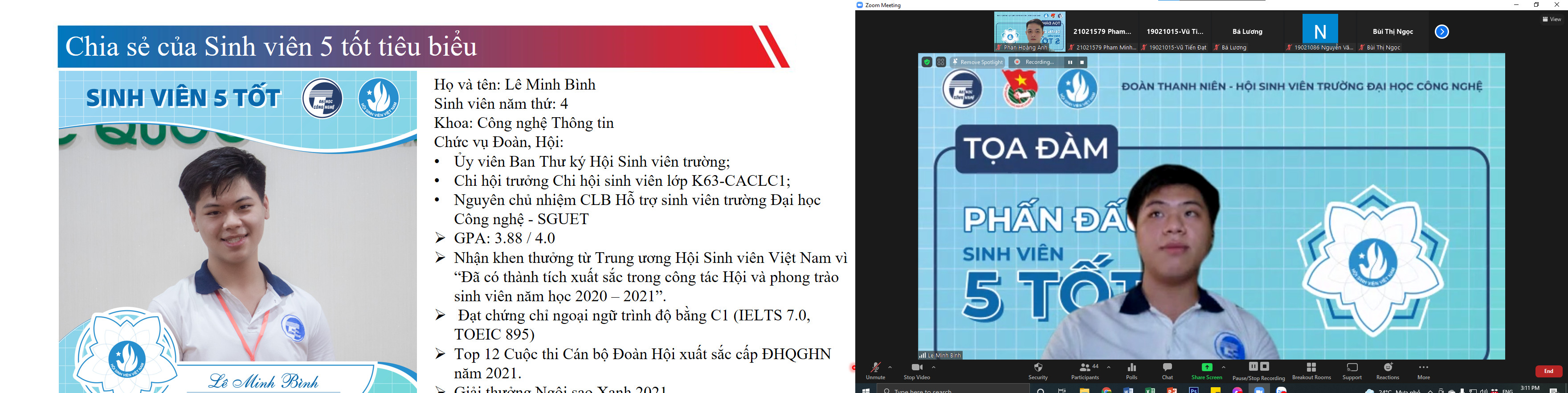 Ngoài ra, các bạn còn được trò chuyện với 2 gương mặt Sinh viên 5 tốt tiêu biểu cấp Thành phố, cấp Đại học Quốc gia Hà Nội. Trong đó, sinh viên Lê Minh Bình – Ủy viên Ban thư ký Hội Sinh viên trường đã chia sẻ về “bí quyết” cân bằng việc hoạt động Đoàn – Hội tích cực, nhưng vẫn đạt được những thành tích học tập đáng ngưỡng mộ. Bình chia sẻ, giữ một chức vụ Đoàn – Hội cao giúp Bình học được cách quản lý thời gian và công việc chặt chẽ, từ đó công việc học tập sẽ không bị ảnh hưởng quá nhiều bởi những hoạt động khác. Cùng với Bình là sinh viên Bùi Khánh Huyền với Giải thưởng Nữ sinh viên tiêu biểu trong lĩnh vực khoa học và công nghệ năm 2021 đã chia sẻ về câu chuyện Sinh viên 5 tốt gắn liền với động lực nghiên cứu khoa học. Chính mong muốn đạt được danh hiệu Sinh viên 5 tốt cấp cao nhất (cấp Trung ương) đã thúc đẩy Huyền bắt đầu con đường nghiên cứu khoa học của mình, cũng chính từ đó, động lực nghiên cứu của Huyền luôn gắn liền với mục tiêu đạt được danh hiệu “Sinh viên 5 tốt”.